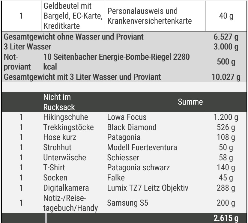 Ein Patentrezept für die optimale Packliste gibt es nicht, jeder Wanderer und jede Wanderin hat seine ganz eigenen und persönlichen Präferenzen. Mein Ziel waren 10 Kilo Gesamtgewicht. Das beinhaltet schon 3 l Trinkwasser und 10 Powerriegel mit insgesamt ca. 2000 kcal (Notreserve). Also ca. 6,5 Kilo Gewicht ohne Proviant und Trinkwasser. Sportlich, aber realistisch!