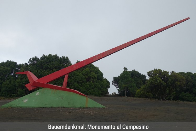 Im geografischen Zentrum der Insel, in den Hochlagen unterhalb des höchsten Berges, steht auf einer Lichtung das Denkmal Monumento al Campesino – im volkstümlichen Sprachgebrauch auch als El Arado bekannt. Der Arado steht stellvertretend für den harten Kampf der Bauern ums Überleben, die Hoffnung auf bessere Zeiten und die Hoffnung auf Demokratie. Ein Jahr nachdem der spanische Diktator Francisco Franco Bahamonde verstorben war, wurde diese Skulptur – ein 16 m langer, aus Eisen geschmiedeter Pflug – nahe dem Kreuz Cruz de Los Humilladeros (Cruz de Los Reyes) an der Landesstraße HI-45 aufgestellt. Der kanarische Künstler Tony Gallardo schuf das Monument im Jahre 1976. Da dieses Kunstwerk inzwischen doch sehr in die Jahre gekommen ist, wird seit 2019 über eine Restaurierung nachgedacht. Dabei geht es nicht um die Sanierung eines Denkmals, sondern um die Bewahrung der Erinnerung an den harten Kampf der Bauern auf der Insel El Hierro. Ein ähnliches Denkmal befindet sich auf der Insel Lanzarote, das Bauerndenkmal „Fruchtbarkeit“ von César Manrique. Es trägt den Namen Monumento al Campesino und wurde zu Ehren der geplagten Landarbeiter auf Lanzarote errichtet. | GPS-Koordinaten 27.727996 -18.026171 | siehe Wanderung 42* |