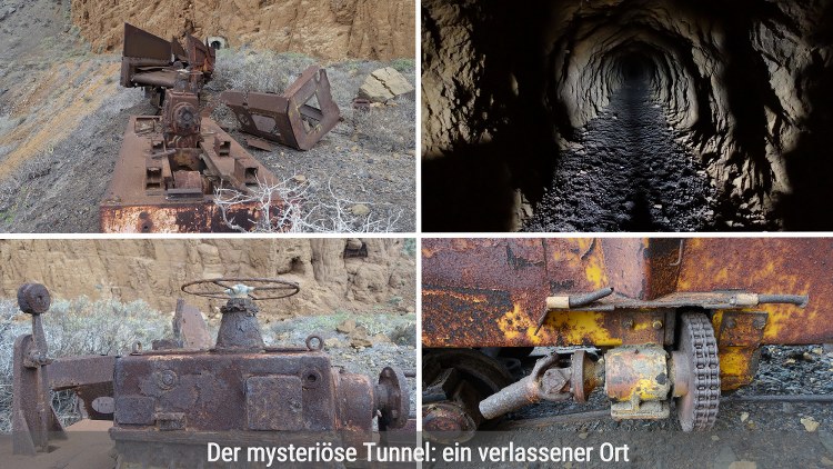 An der nordwestlichen Küste von El Hierro führt die Landesstraße HI-500 am Thermalbad Pozo de La Salud vorbei und weiter bis zum Brandungstor Arco de La Tosca, das aber nicht von der Straße aus einsehbar ist. Auf der linken Straßenseite erhebt sich ein Berg mit markantem ockergelben Gestein. Aus der Entfernung sind an dessen Sockel Bergbauloren und eine Zugmaschine zu erkennen, zu denen man aber nur über steil bergauf führendes und rutschiges Gelände gelangt. An diesem mysteriösen Ort befinden sich arg verrostete Gerätschaften sowie ein verschlossener Tunnel, den man nicht betreten darf. Was ist hier passiert? Wofür war dieser Tunnel dar? Viele Fragen, wenige Antworten. Der Tunnel soll ca. 2,5 km in den Berg führen. Angeblich sollte er genutzt werden, um von geplanten Feldern an der Nordwestküste die geernteten Früchte abzutransportieren. Genaues weiß der Autor nicht, trotz intensiver Recherche. In keiner Karte ist verzeichnet, was hier einst war, oder hätte werden sollen; aber ein sehr spannender verlassener Ort wie ich meine. | GPS-Koordinaten 27.759635 -18.141314 | siehe Wanderung 28* |