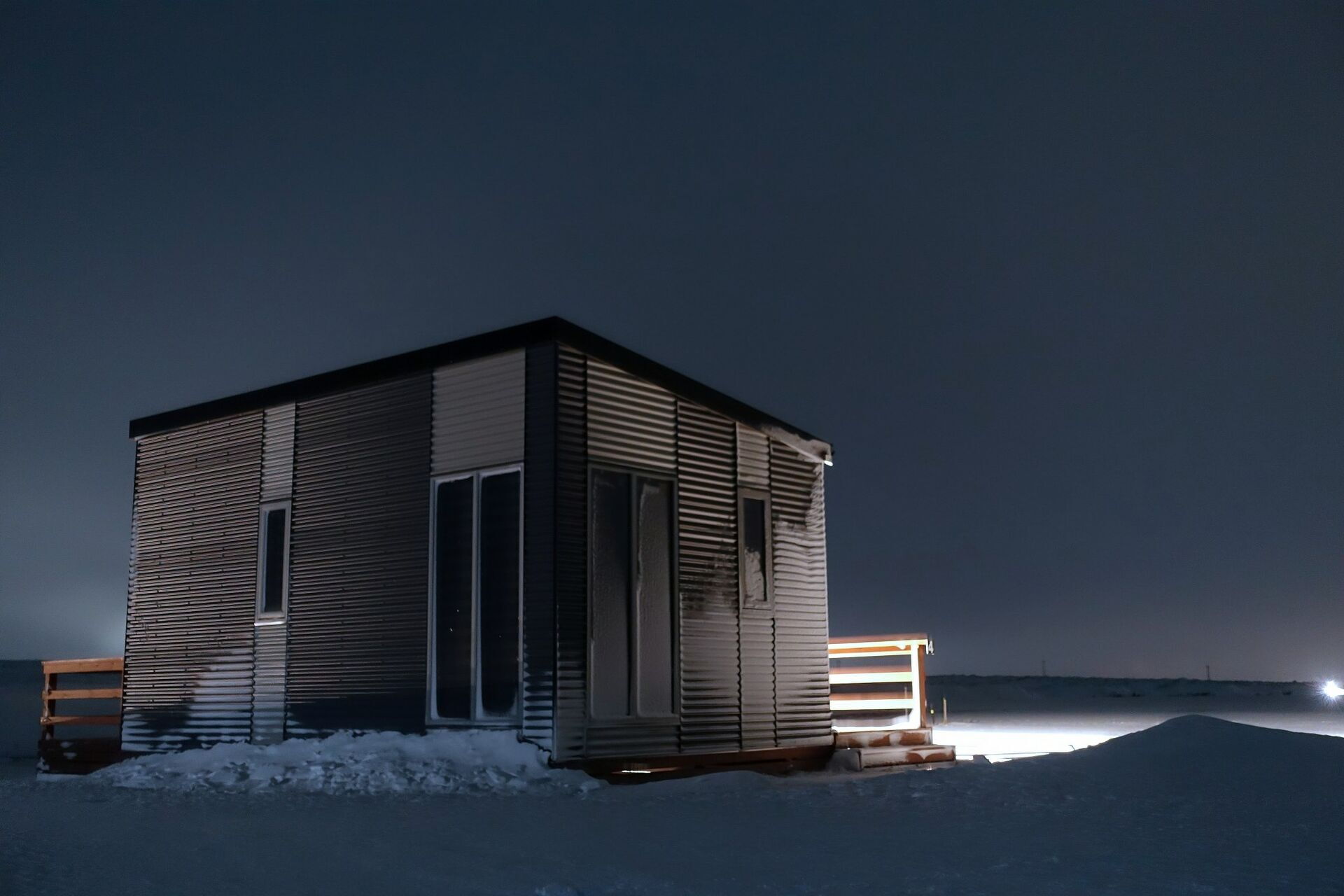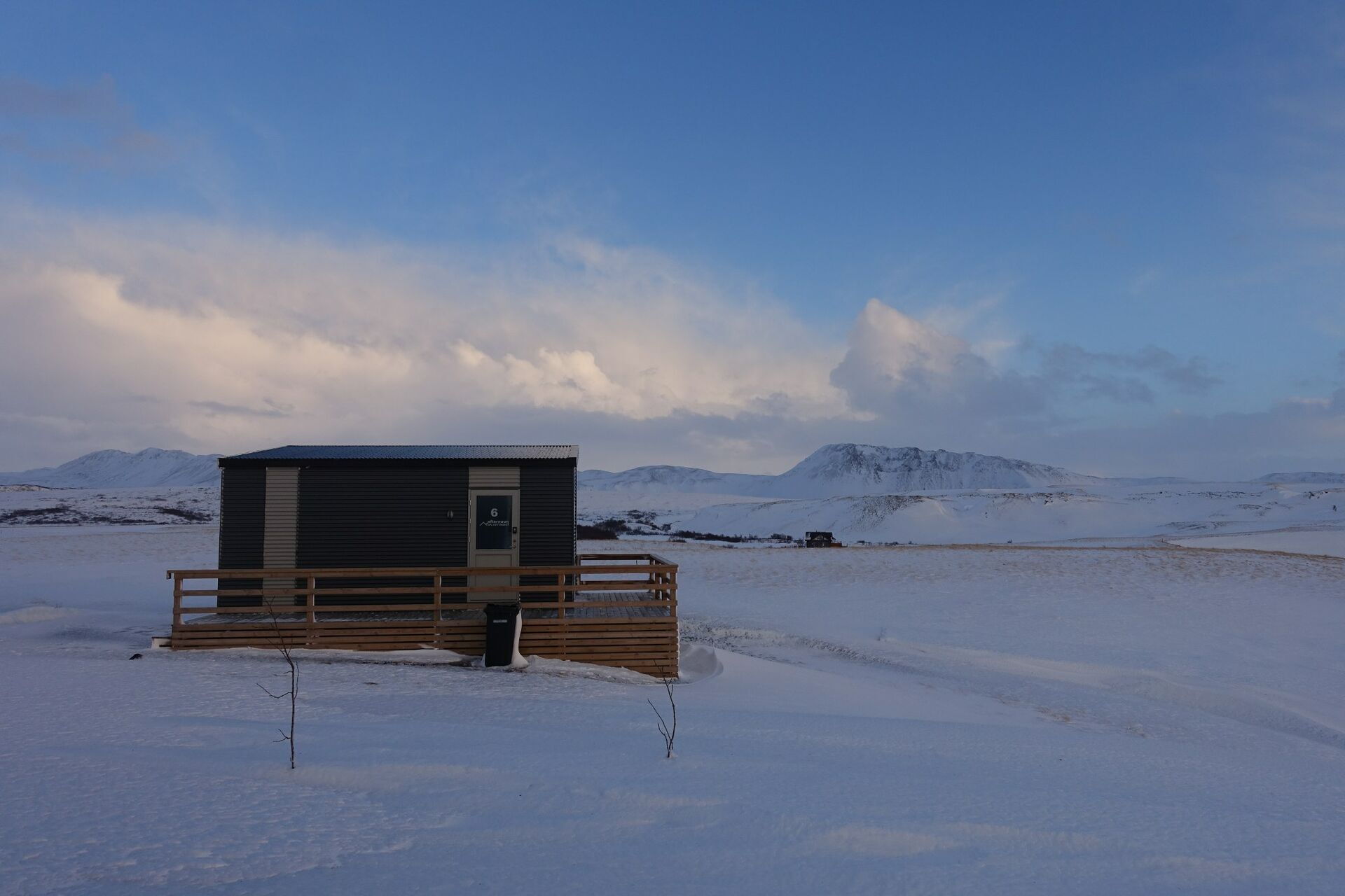 Island – Das Afternoon Cottage während eines Schneesturms.