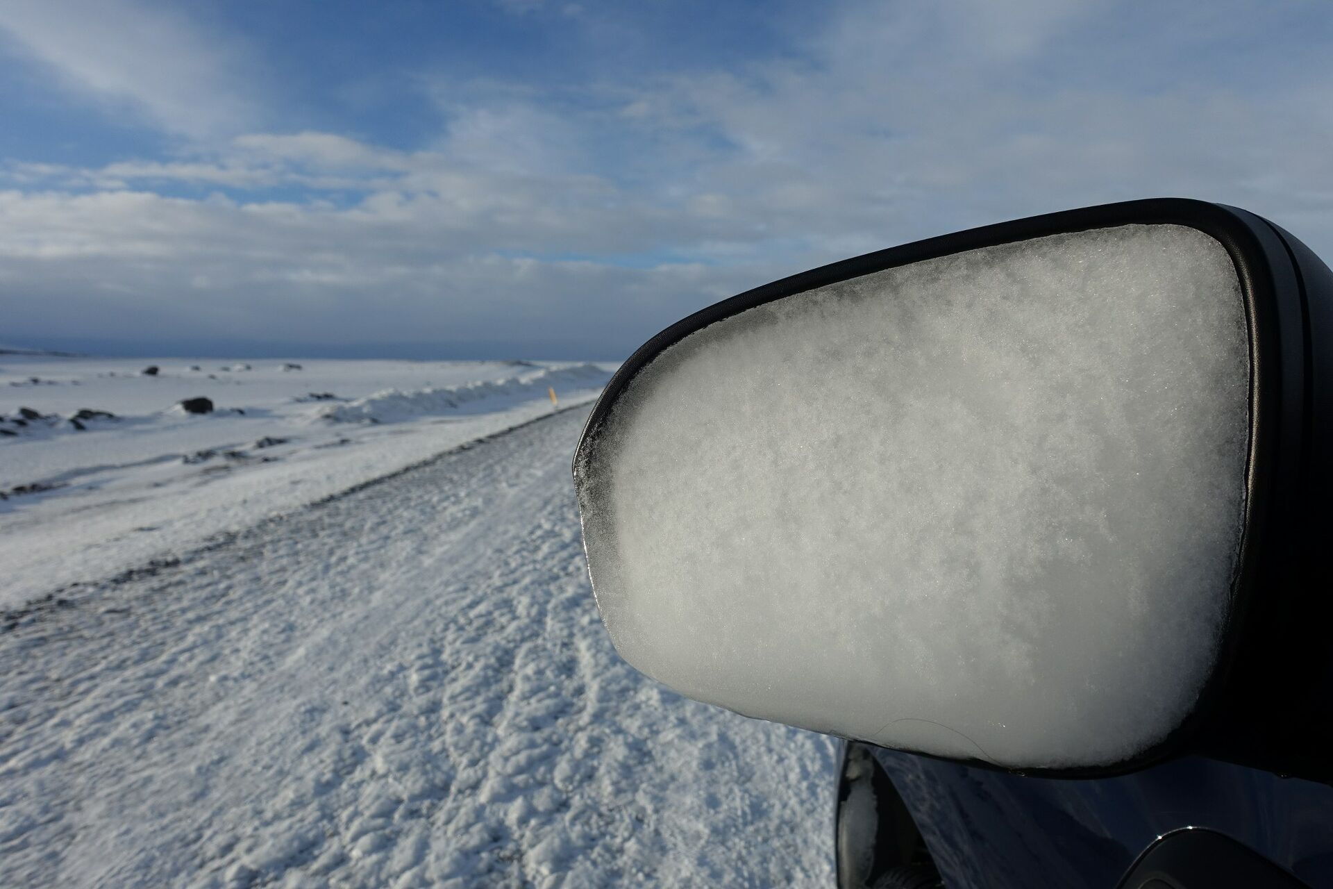 Island – Nur in Island möglich, Schnee am Rückspiegel.