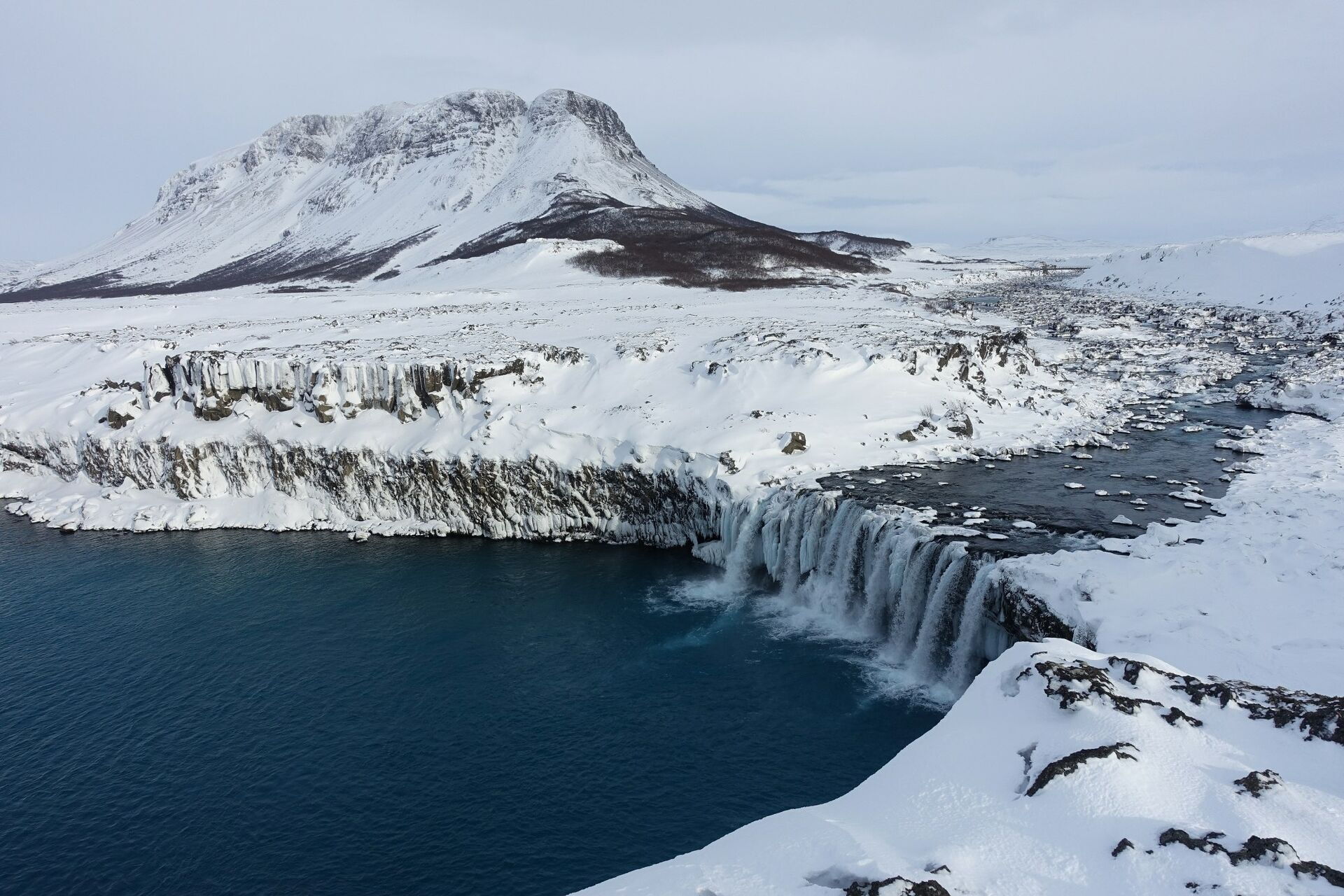 Island – Am Hjálparfoss macht die Fossá bei einem Schneesturm ihrem Namen alle Ehre.