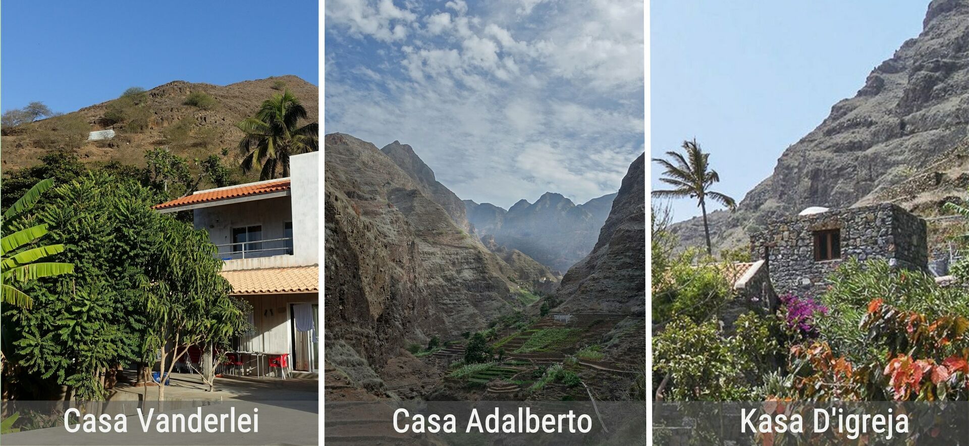 17.107385 -25.242605 | Die familiär geführte Pension Casa Vanderlei befindet sich in Ribeira da Cruz. Das komfortable Privathaus liegt inmitten eines Gartens und bietet seinen Gästen einen schattigen Außenbereich. Ein Pool ist in Bau. Unterbringung: Es stehen unterschiedliche Doppelzimmer mit Gemeinschaftsbad zur Verfügung, sowie ein Zimmer mit eigenem Bad/WC. Verpflegung: Halbpension. Alle Zimmer verfügen über WLAN. | €€ | Rocha Lima Porto Novo | vanderleyclrocha@gmail.com | Tel.: +2382274048 | zu buchen unter http://www.ruraltours.cv | siehe Touren 16–18 |