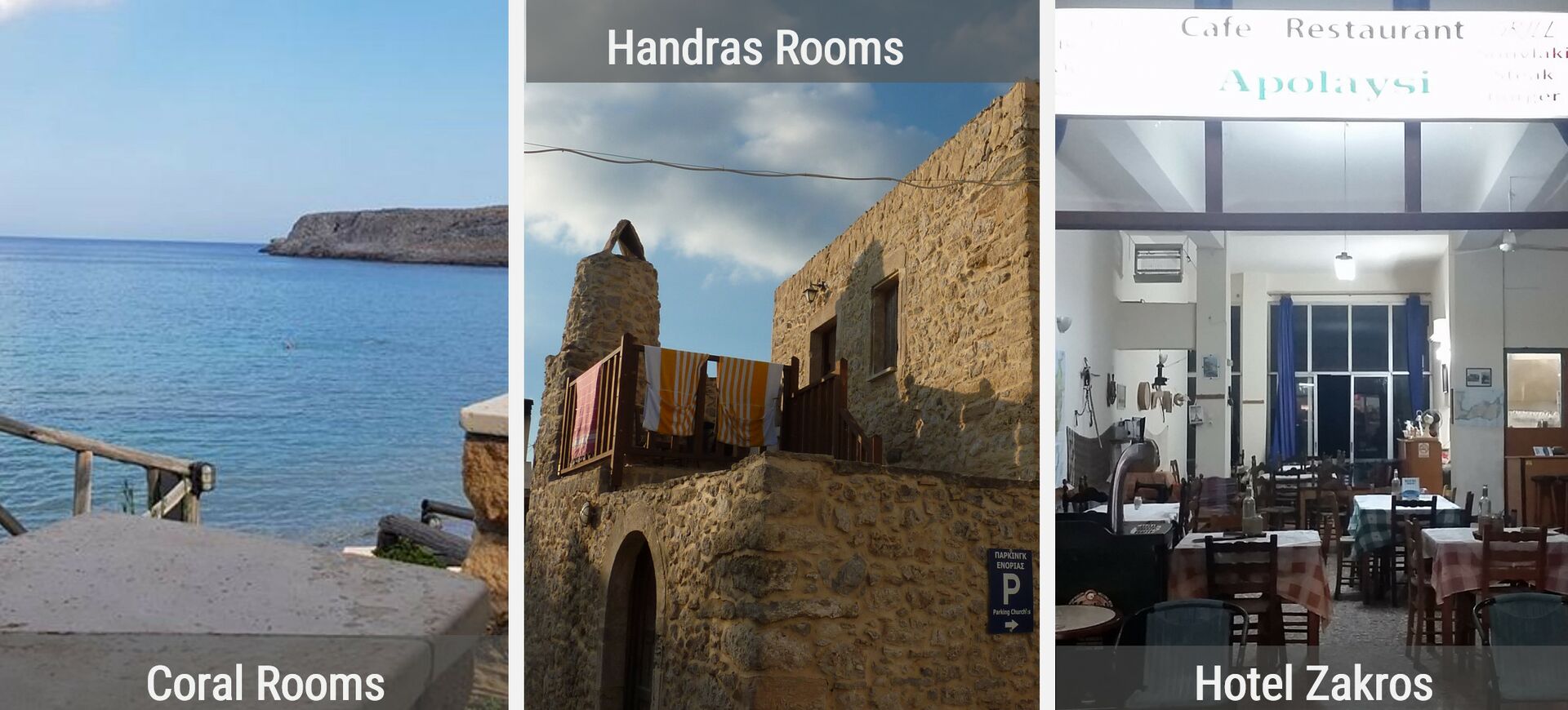 Das Hotel Zakros, mit 10 sehr einfachen Zimmern befindet sich am Hauptplatz von Zakros. Ein einfaches Frühstück wird auch gereicht. Ein besonderer Service: Der Eigentümer Markos Daskalakis holt Sie gerne mit dem Pkw in Palekastro ab – natürlich nur, wenn Sie bei ihm übernachten. Der Bus von Palekastro nach Zakros fährt nur Montag, Mittwoch und Freitag. | Eleytherias 1, 72300 Zakros | hotelzakros@hotmail.com | Tel.: +302843093326 oder mobil +306983630038 | GPS-Koordinaten 35.112730 26.218892 | Link zu Booking.com |