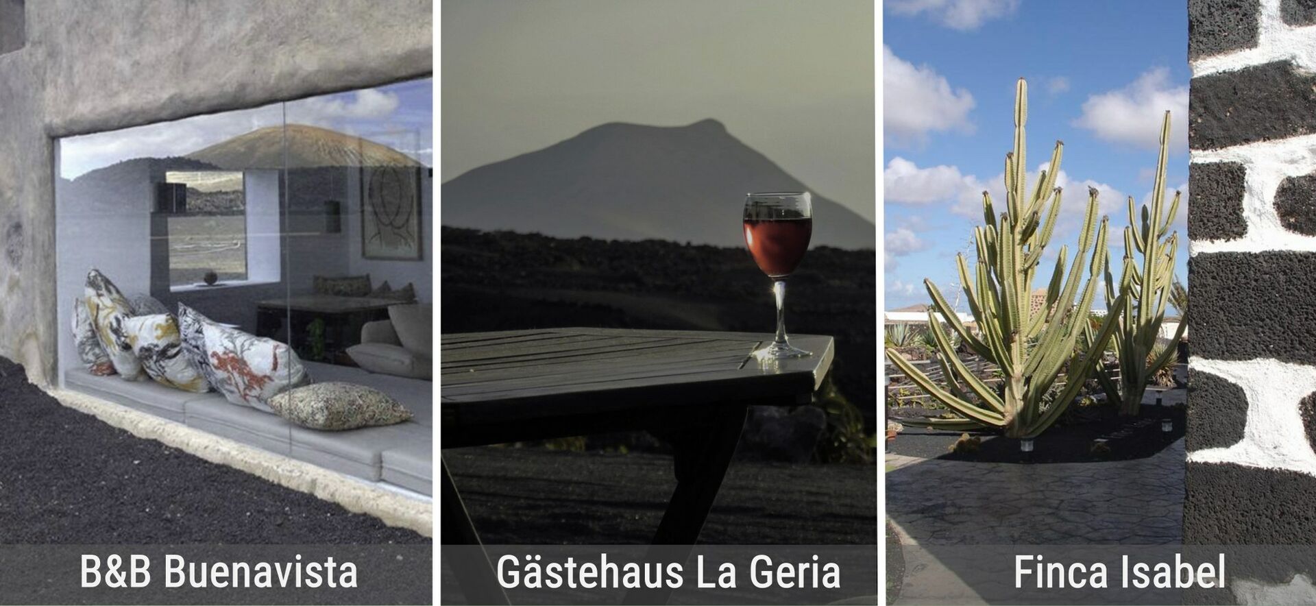 Die zwei Appartements liegen in einem 20 ha großen Weingut inmitten des Naturparks La Geria. Jedes Appartement verfügt über ein Schlafzimmer mit großem Doppelbett, ein Wohnzimmer mit Fernseher und eigenem Bad. Die großen Fenster in den Räumen erlauben eine atemberaubende Sicht auf die Landschaft. Die Dekoration ist der umliegenden Vulkanlandschaft entsprechend minimalistisch und funktionell gehalten. Es wird ein komplettes Frühstück mit vielen hausgemachten Überraschungen angeboten. Die Reinigung der Räume erfolgt täglich. Da der nächste Sandstrand 8 km entfernt ist. | €€€ | Carretera Conil-Tegoyo 22, 35572 La Asomada | GPS-Koordinaten 28.975248 -13.684352 | zu buchen bei Bookings.com | siehe Wanderungen 23 und 29 |