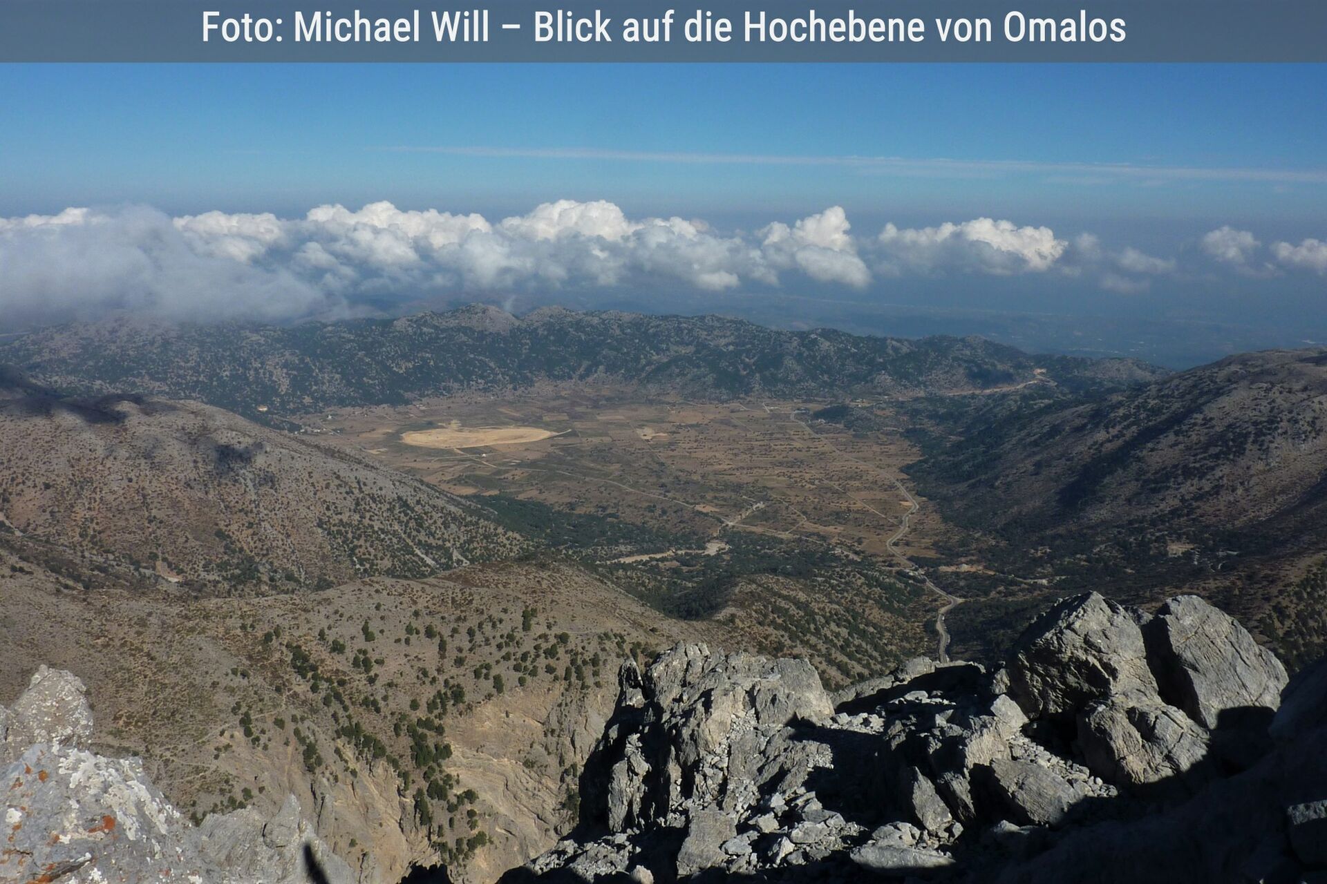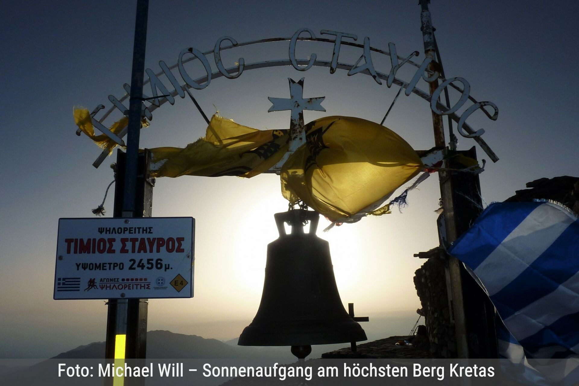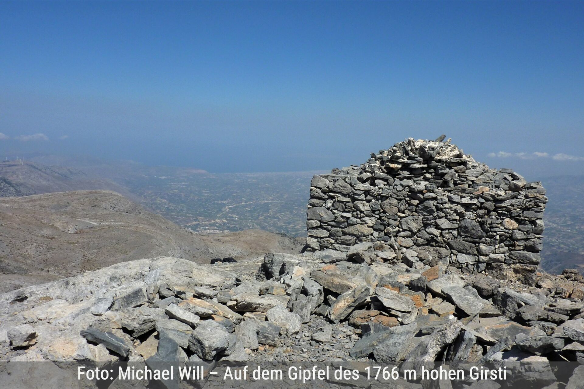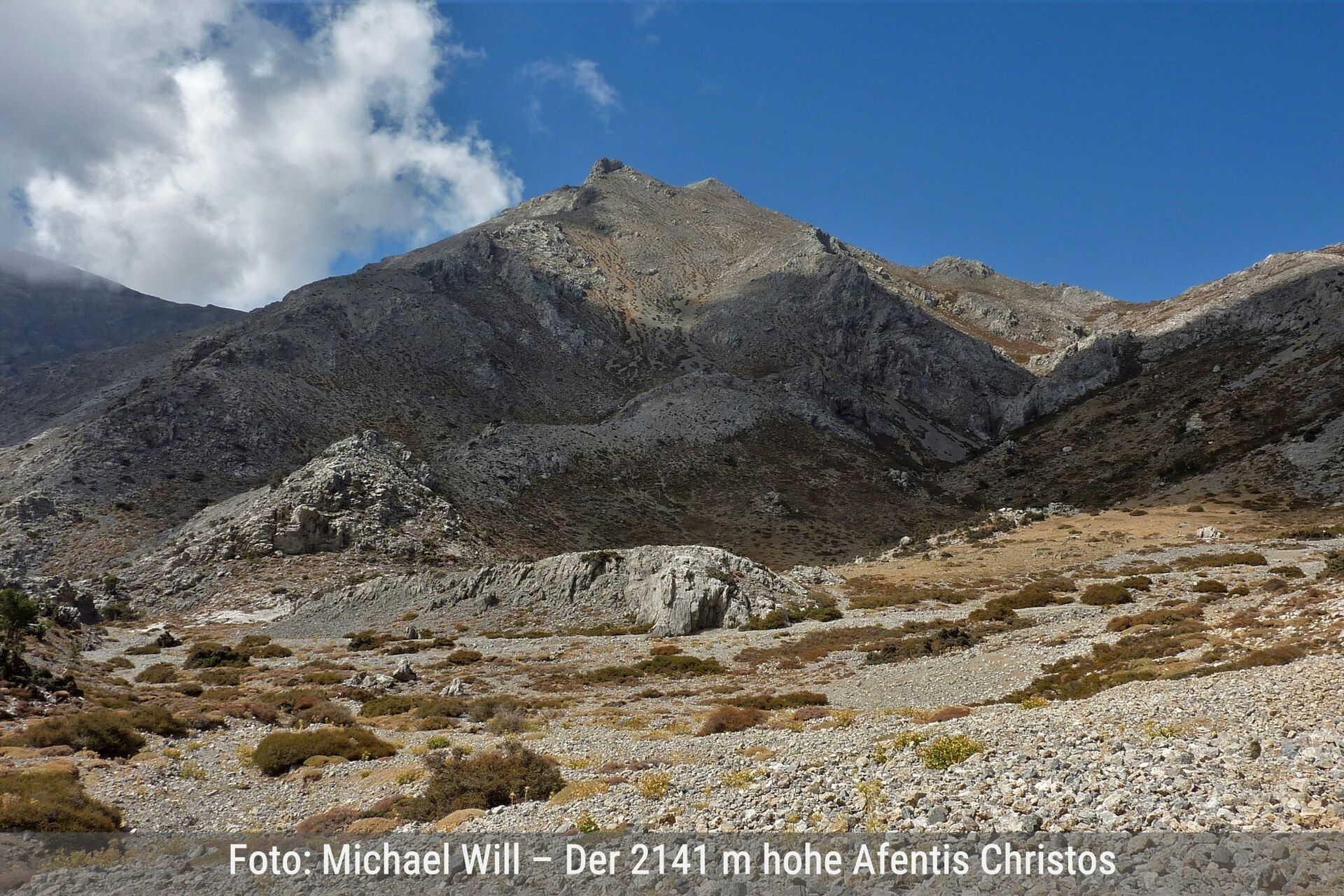 Es erwartet den Wanderer eine schwere hochalpine Tour durch meist ruhiges Felsgelände mit mäßiger Steigung. Starke Winde, unerwartete schnelle Wolkenbildung, Restschneefelder bis Mitte Juni und sehr viele große Erdlöcher – in die man leicht stürzen kann – gehören zu den möglichen Widrigkeiten. Das Psiloritis-Massiv ist eines der drei Gebirge auf Kreta, das über 2000 m Höhe reicht. Der für den Gebirgszug namensgebende und 2456 m hohe Psiloritis markiert die höchste Bergspitze. Auf dieser thront wie eine steinerne Burg die Gipfelkapelle, auch Timios Stavros (Ehrwürdiges Kreuz). Der Psiloritis ist umgeben vom 2424 m hohen Agathias, dem 2325 m hohen Stolistra, dem 2267 m hohen Voulomenou und dem 2209 m hohen Koussakas. Bei schönem Wetter erlebt man die Natur in ihren schönsten Facetten. Ein absolutes Highlight ist es, den Sonnenuntergang sowie auch den Sonnenaufgang auf dem höchsten Gipfel Kretas zu erleben, wenn man in der kleinen Steinkapelle übernachtet. | Siehe Wanderung 14 |