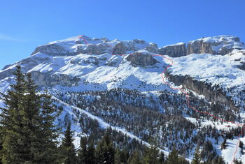 Bei schneereichen Wintern eine sensationelle Variante durch ein Tal direkt unter der Marmolada-Seilbahn.
