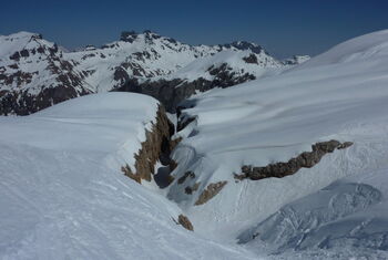Kurze, aber knackige Abfahrt, die noch bis zum Ende der Saison gute Schneebedingungen aufweist.