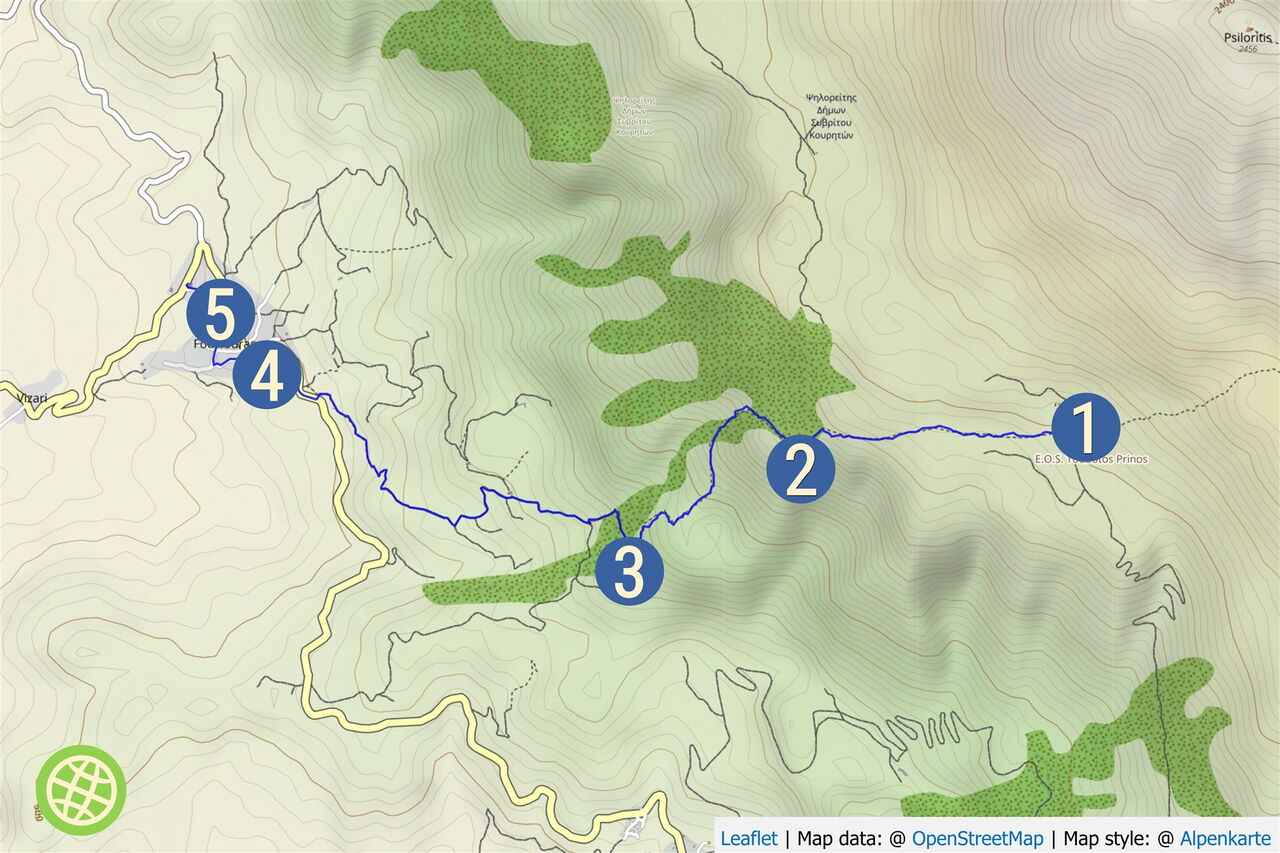 Charakter: Eine leichte Wanderung. Auf dem Sonnenhang und im Windschatten des Psiloritis kann es bei nur wenigen schattigen Abschnitten sehr heiß werden. Art des Weges: 20 % Schotterpiste und 80 % Pfade. Zusatzausrüstung: keine. Minimarkt und Taverne Windy Place, GPS-Pkw: 35.212317 24.712867 am Tourende. Beste Wanderzeit: Frühjahr, Sommer und Herbst.