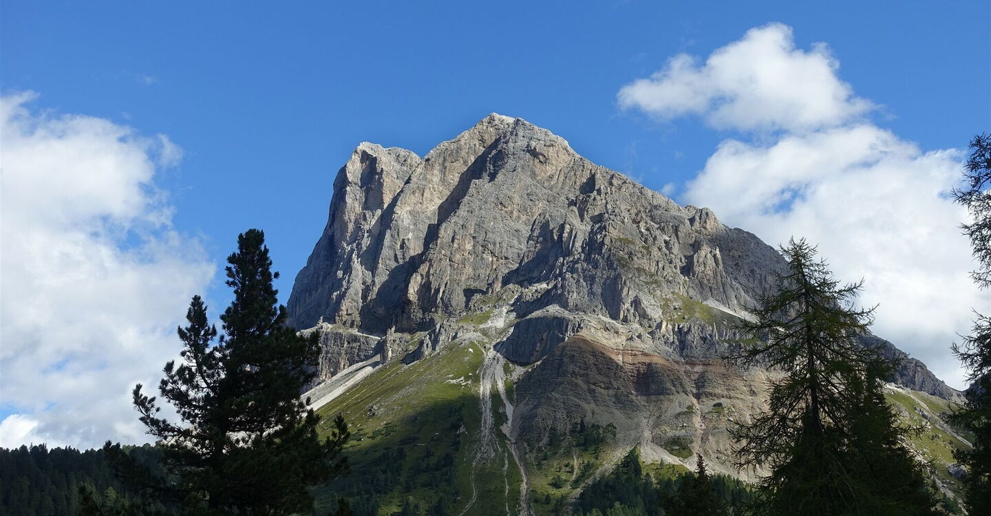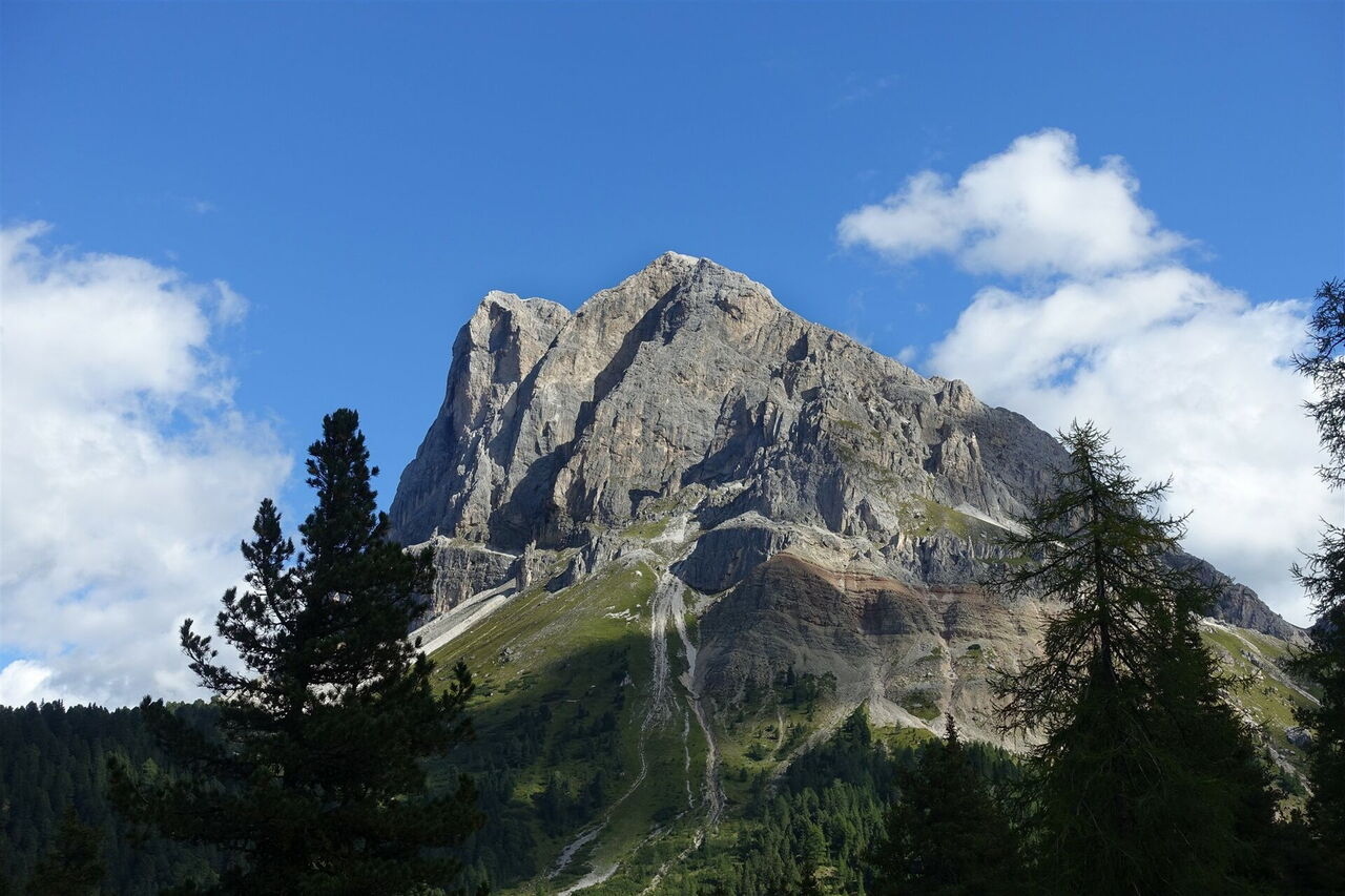 Nach ca. 2 km zweigt halb rechts die Schotterpiste zur 02 Schatzerhütte (2.004 m) ab. Wer keinen Espresso zur Stärkung benötigt, geht geradeaus weiter. Bei der darauffolgenden Gabelung der beiden Pisten gehen wir nicht halb links bergauf, sondern halb rechts. Nach einigen Metern mündet von links ein Pfad in den unsrigen. Es handelt sich hierbei um die Tour 31, die Hauptroute des Dolomitenhöhenweges Nr. 2. Die nächsten zwei rechten Abzweiger ignorieren wir, um dann am dritten Abzweiger rechts Richtung Peitlerscharte zu gehen, nun auf dem Wanderweg 4.