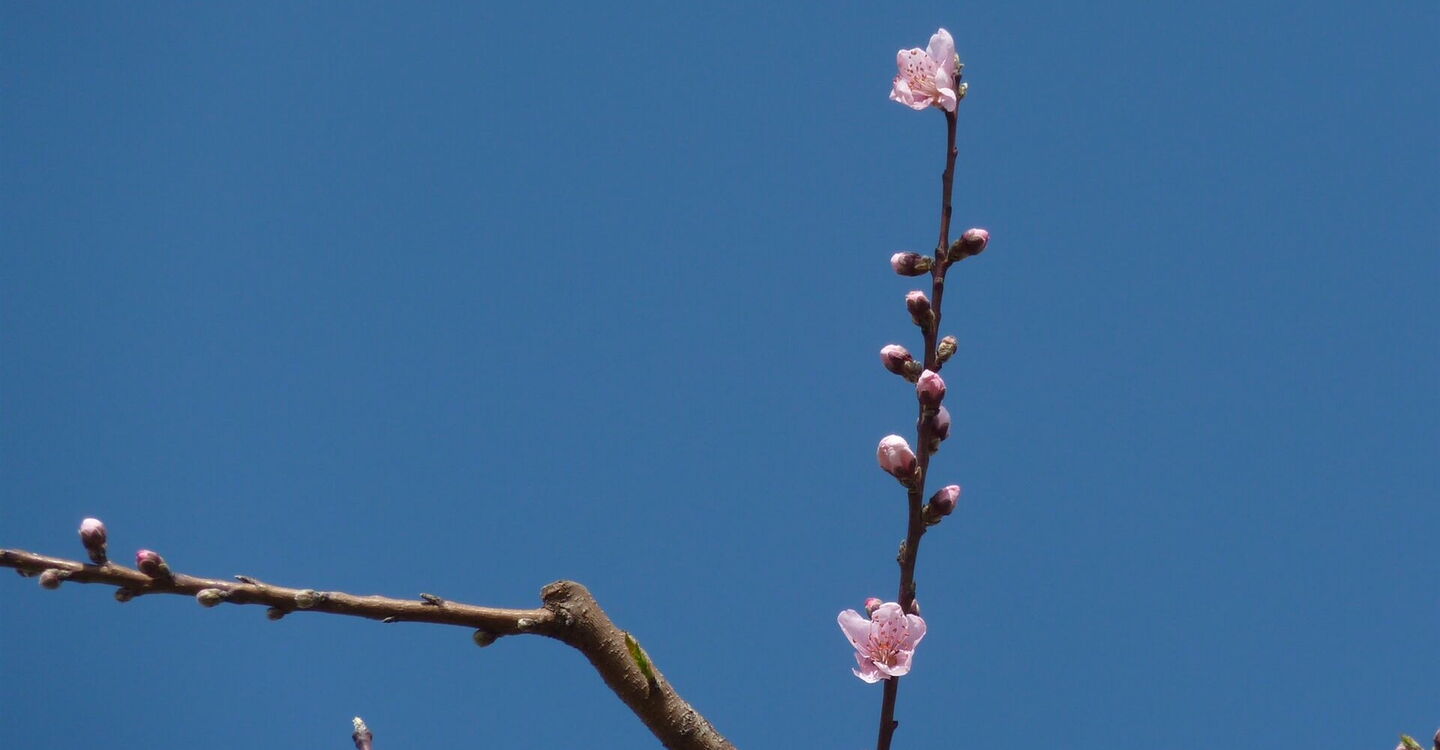 Vom (01) Start und Ziel (321 m) gehen wir 130 m auf der Straße Richtung Embona, um dann bei den Weinreben scharf rechts auf die Schotterpiste abzubiegen und dieser entlang der vielen fruchtbaren Felder nun bergab zu folgen. Die Wirtschaftswege nach rechts und links ignorieren wir, bis ein Bachbett die Straße gequert hat und wir nach einem kurzen Anstieg eine Weggabelung erreichen.