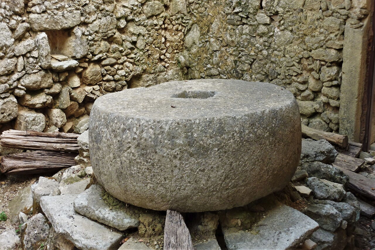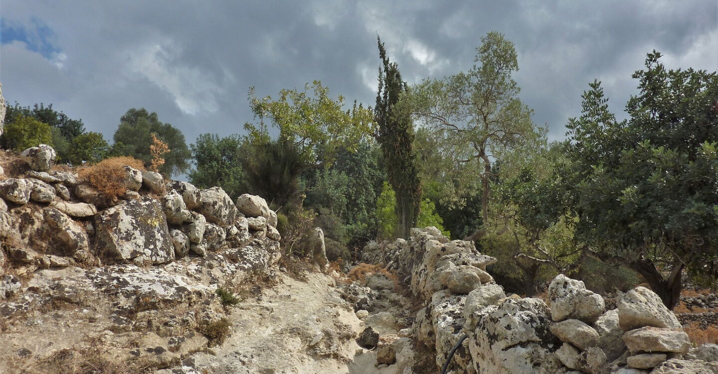 Wir folgen dem Wegweiser Richtung Ano Malaki, kommen im weiteren Verlauf an einer mit Steinen gepflasterten 02 Quelle (519 m) vorbei und überqueren eine Bergkuppe. Wir sehen rote Pfeile, die nach links weisen. Der Ausschilderung folgen wir auf der Schotterpiste Richtung Saitouris. Nur kurz später umlaufen wir ein schattiges Waldstück. Nach einer scharfen Rechtskurve endet unsere Piste und wir gehen links durch eine kleine Senke, rechts führt ein Bachbett in die Schlucht. Auf der Anhöhe ignorieren wir den linken Abzweiger. Wir treffen auf zwei aufeinanderfolgende Weggabelungen, an denen wir jeweils links gehen, um dann nach einem kurzen Anstieg, ca. 150 m, rechts weiterzuwandern. Bei der darauffolgenden Dreiwegegabelung gehen wir geradeaus weiter. Unsere Piste endet und wir gehen rechts, bis die Piste sich gabelt und wir halb links durch das Dickicht gehen. Diese Piste endet und auf einer weiteren Piste gehen wir rechts durch die Schlucht.