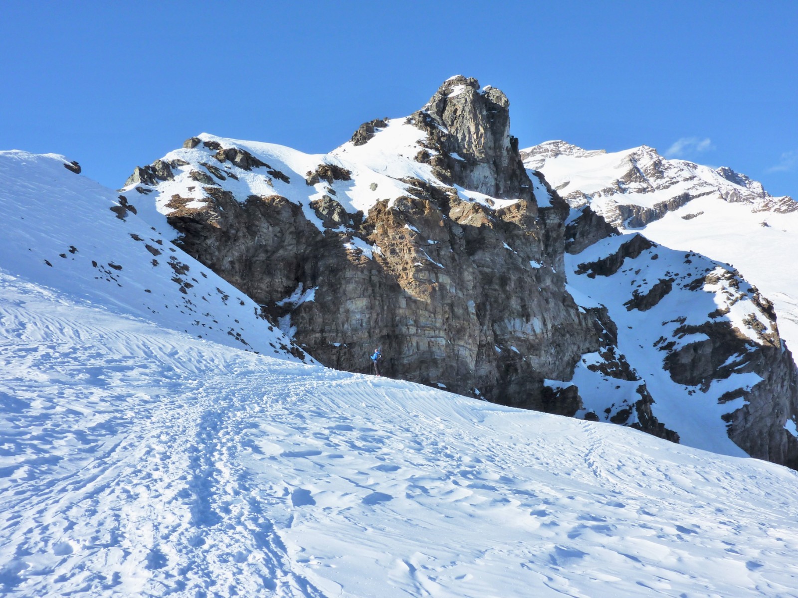 Nach einem kurzen Aufstieg und einer Abfahrt mit dem Ziel vor Augen kommt man wieder ins Skigebiet zurück. Die Abfahrt führt über einen Osthang. Folgende Ausrüstung wird empfohlen: Produkte für alpine Sicherheit im Schnee, Freerideski und Skitourenhelm. Es gibt keine Einkehr auf der Tour. Außer man nimmt vor oder nach der Tour eine Stärkung in dem Rifugio Città di Vigevano. Beste Jahreszeit: Januar bis April. Uns erwarten kurze Stücke mit bis zu 30° Hangneigung.