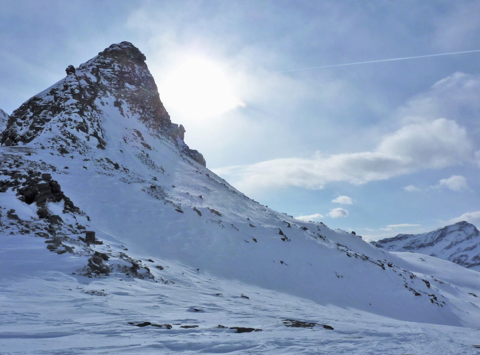 Wir fahren direkt auf den Monte Schwoarzehore zu und sehen links, wie sich ein Hochtal öffnet. Abwärts gehen wir mit Fellen direkt zum Passo Zube.