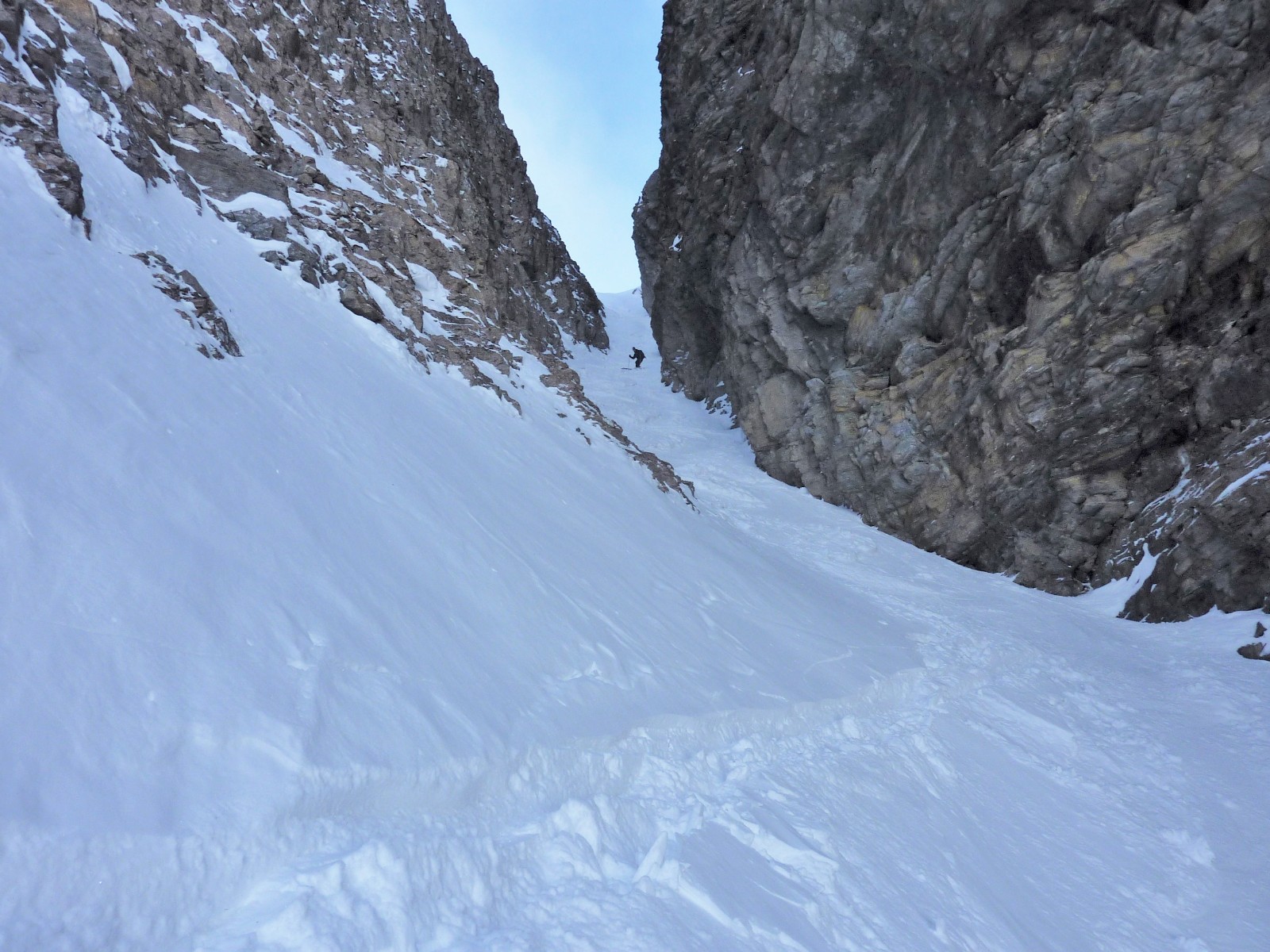 Wir fahren ins andere Tal hinunter. Nach ca. 800 m gilt es Ausschau zu halten nach dem Einstieg in die 500 m lange und steile Scharte.