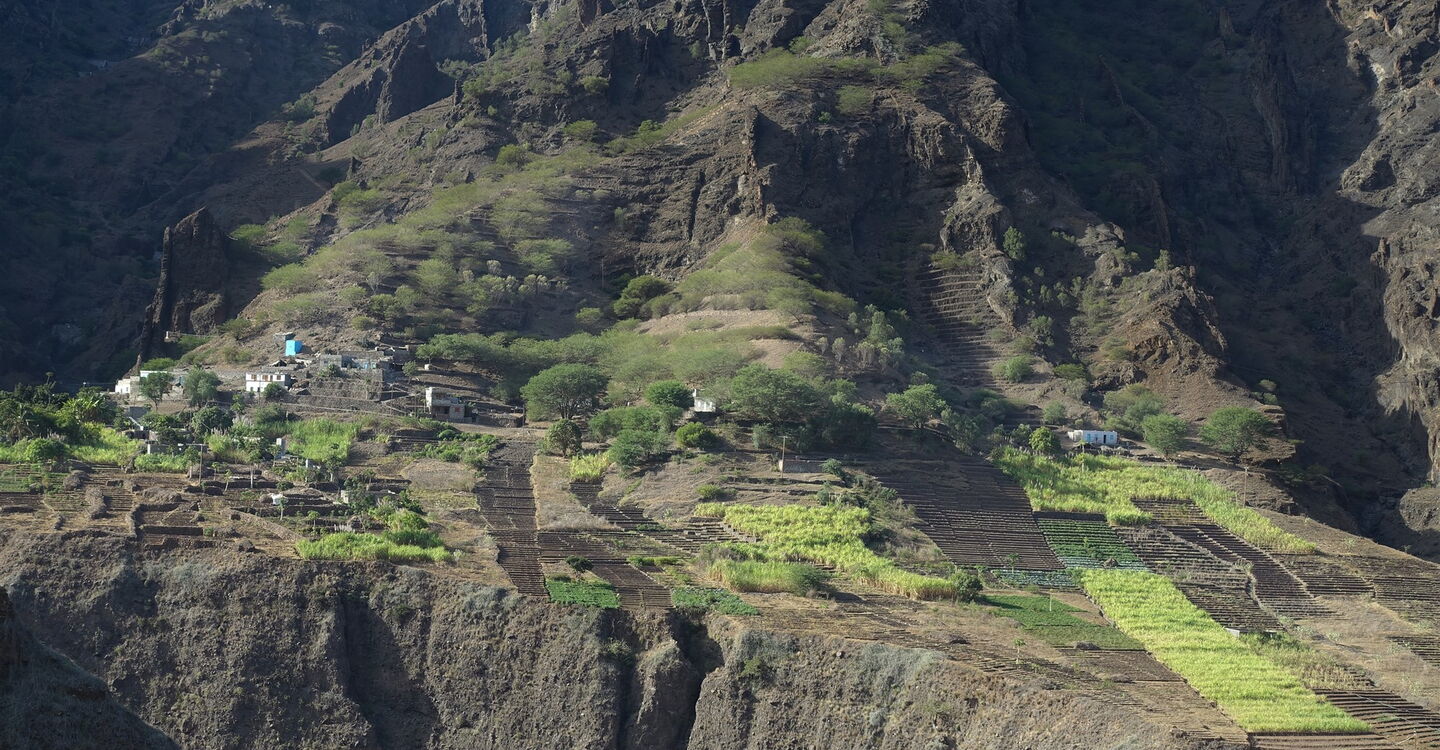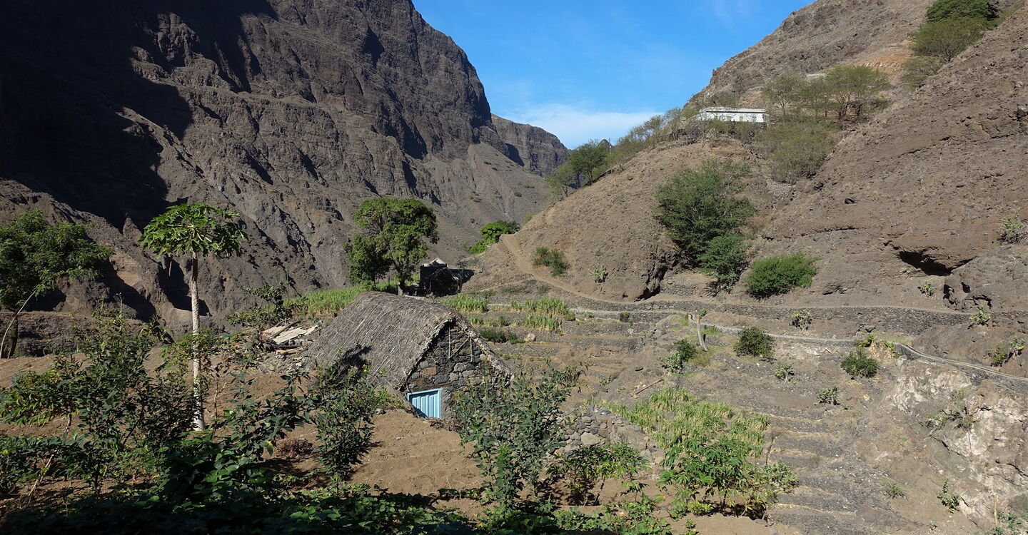 Besonders intensiv erlebt man auf der heutigen Tour die grünen Oasen, die durch die Besiedlung entstanden sind. Die Bauern haben über Generationen das wüstenartige Gelände eingeebnet, so entstanden effizient angelegte Terrassenfelder. Während sich das Trockenflussbett des Ribeira do Alto Mira Richtung Meer schlängelt, gibt es auf seinem Weg immer wieder Quellen. Deren Wasser wird in geschickt ausgeklügelten Systemen über Wasserleitungen verteilt, um die kleinen und weit abgelegenen Oasen mit der kostbaren Flüssigkeit zu versorgen. Landschaftsprägend ist auch die über Jahrtausende entstandene tiefe Schlucht des Ribeira do Alto Mira, die von steilaufragenden Bergen flankiert wird. Durch diese überwältigende Szenerie führt die heutige Wanderung bis zum Endpunkt der Tour, dem gottverlassenen Dorf Ribeira da Cruz, im nordwestlichen Teil der Insel Santo Antão.