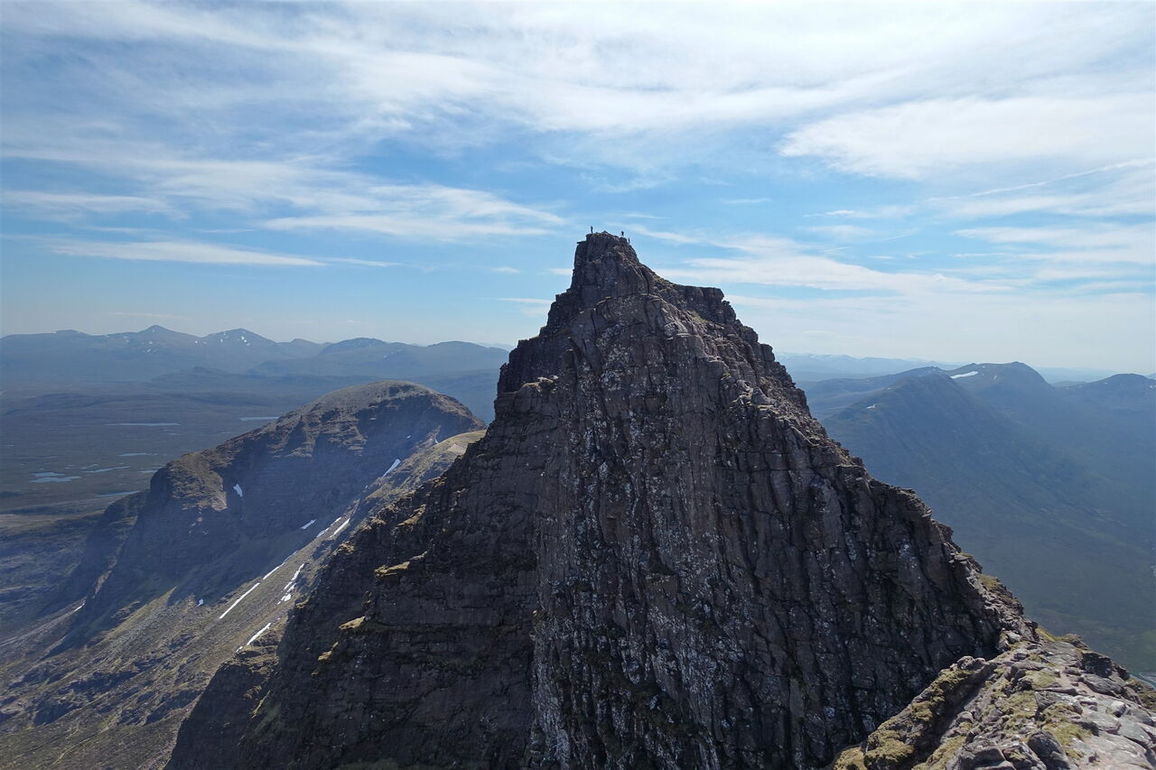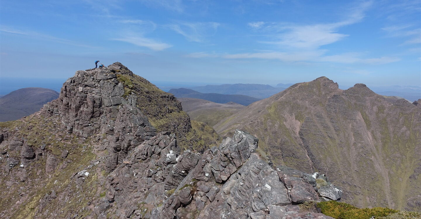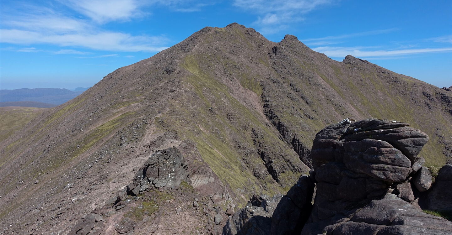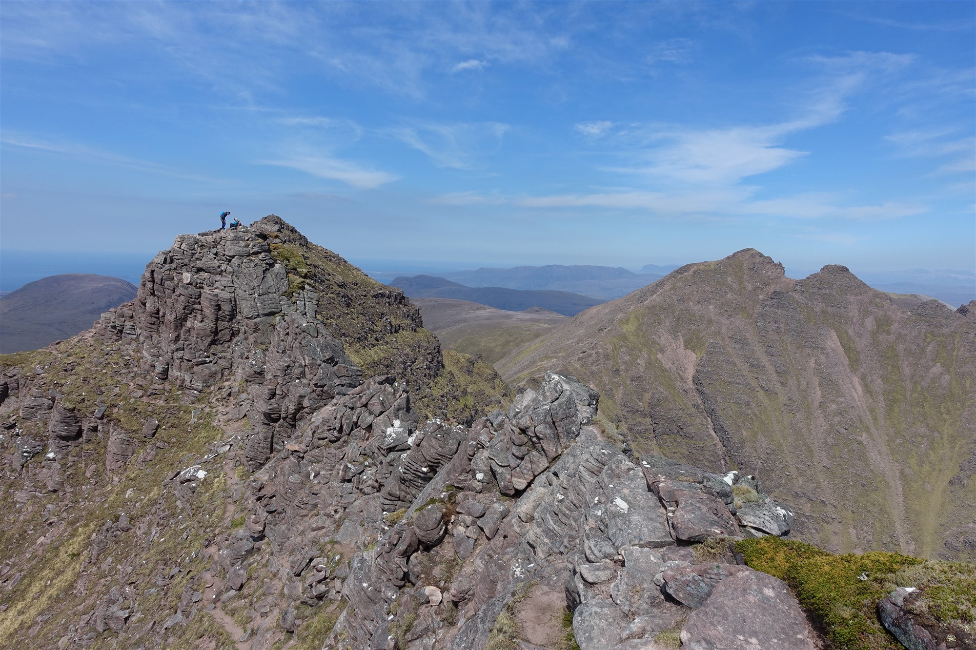 In einem Halbkreis gehen wir um den links von uns liegenden Hügel zur Einsattelung zwischen dem Glas Mheal Mor und dem Bidein a' Ghas Thuill mit seinen flachen Sandsteinplatten. Von dort steigen wir dann direkt auf dem felsigen Grat oder auf einem der vielen gerölligen Pfade, die sich durch den steilen Berghang ziehen, bis zum Gipfel des 02 Bidein a' Ghas Thuill (1062 m) auf. Dies ist der höchste der beiden Munros von An Teallach. Es ergibt sich eine 360°-Rundsicht, aber automatisch schaut man gebannt Richtung Südwesten, wo sich ein spektakuläres und einmaliges Panorama auf den Nachbargipfel Sgùrr Fiona und die kleinen Felsspitzen des Corrag Buidhe bietet – die wohl eindrucksvollste Aussicht in den schottischen Bergen.