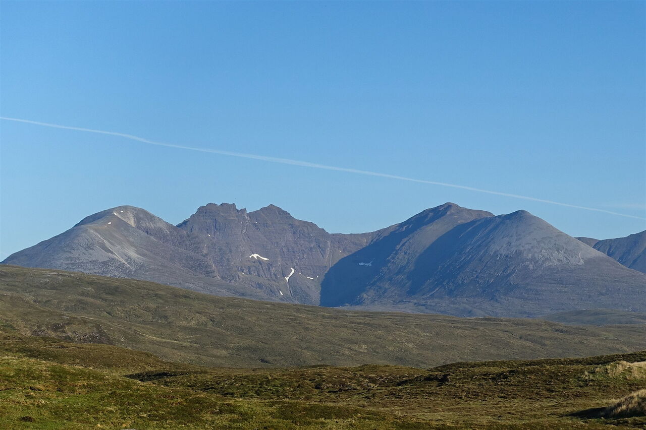 Vom 01 Parkplatz (89 m) gehen wir auf dem Seitenstreifen der A832 Richtung Dundonnell. Den rechten Abzweiger am roten Briefkasten ignorieren wir und gehen geradeaus weiter, um hinter einem Bungalowpaar nach 3,8 km auf einem links abzweigenden Pfad den Aufstieg zu beginnen. Nach 5 km gehen wir bei einem Steinmännchen nicht geradeaus weiter, sondern folgen dem rechts abzweigenden und weniger sumpfigen Pfad. Der geradeaus weiterführende Pfad ist die neue Route, aber weitaus sumpfiger! In engen Kehren führt der Pfad bergauf und wir genießen eine traumhafte Aussicht auf den sich vor uns erhebenden felsigen Grat des Meall Garbh. Auf dem nachfolgenden Bergrücken mit platt geschliffenem Sandgestein verliert sich die Spur des Pfades. Wir steigen nun parallel zum unterhalb liegenden Tal mit dem neuen Wanderweg zu einer Anhöhe, dem sogenannten Sron A‘ Choire, auf.