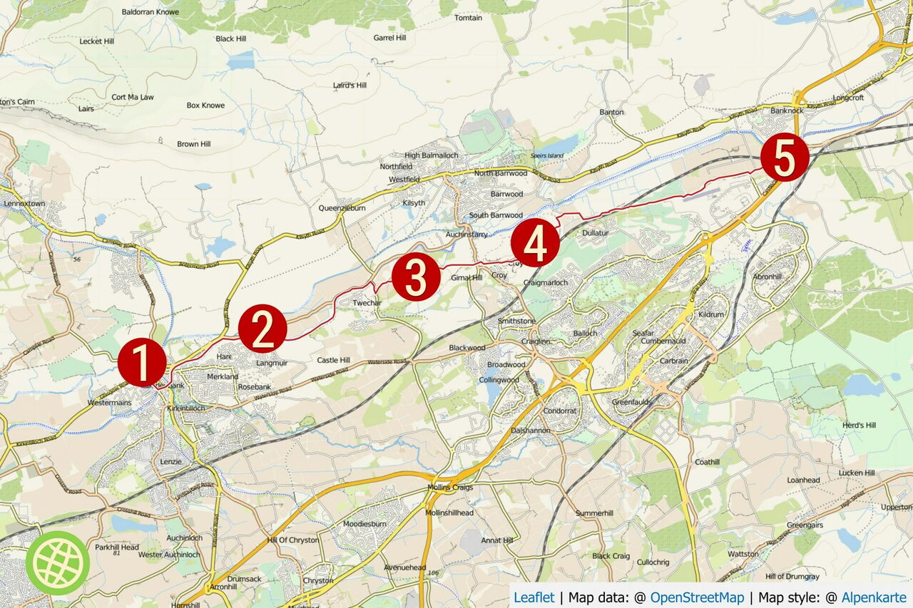 Mittelschwere Wanderung aufgrund ihrer Länge und des erhöhten Navigationsaufwands wegen der vielen Abzweiger. Art des Weges: 20 % Pfad, 40 % Piste und 40 % Straße. Zusatzausrüstung: Keine. Einkehr: am Anfang und am Ende der Wanderung. Beste Wanderzeit: Ganzjährig. Sehenswert Region: die Kelvingrove Art Gallery und Museum, Entfernung 18 km, Geokoordinaten 55.868625 -4.290733, und das Riverside Museum of Transport and Technology, Entfernung 18 km, Geokoordinaten 55.865175 -4.306314.