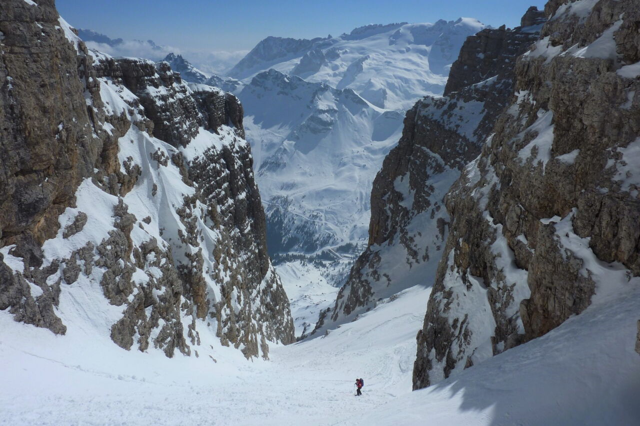 An der südöstlichen Flanke des Piz Boè fahren wir zum Einstieg ins nicht zu verfehlende Val de le Fontane, von wo man traumhafte Ausblicke auf die Marmolada und bis hinunter auf die Straße hat.