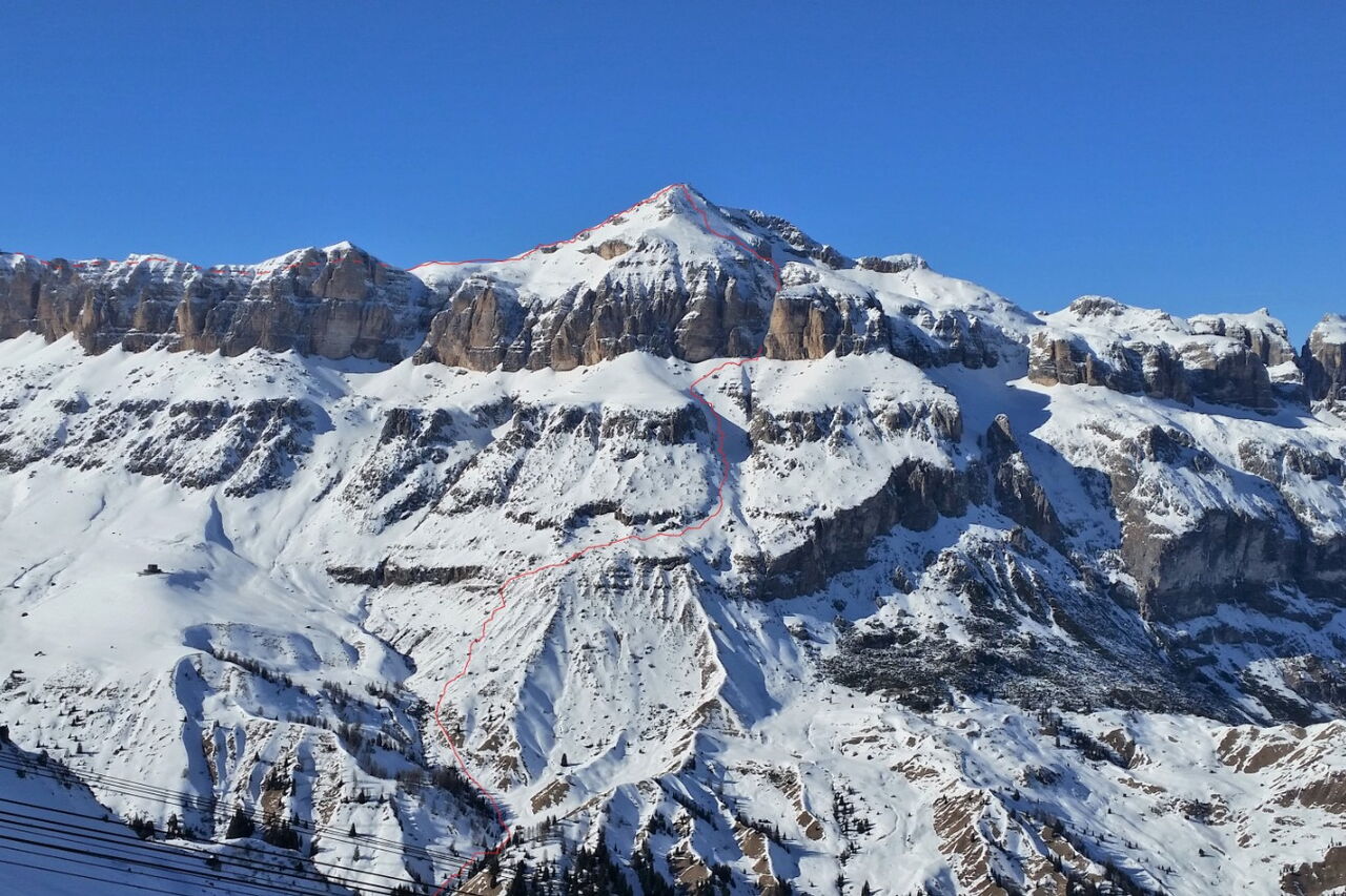 Nach der Pordoi-Seilbahn Nr. 120 fahren wir zum Rifugio Forcella Pordoi ab. Von hier geht es geradeaus weiter, dem Bandwurm zum Mittagstal folgend, bis wir dann abschnallen, um den Piz Boè zu besteigen.
