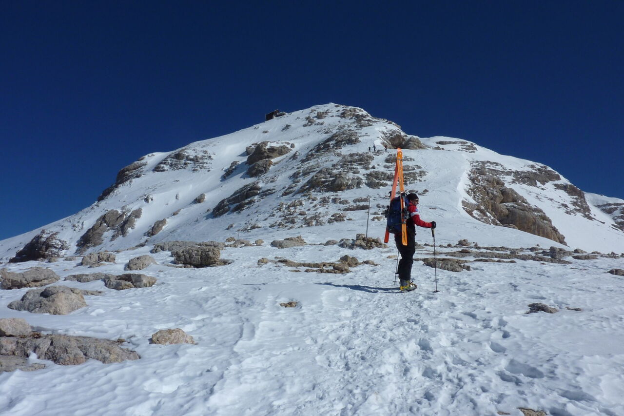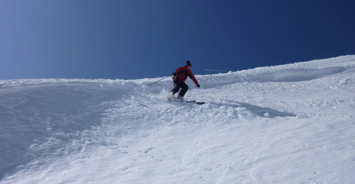 Einfache Orientierung, da der zu besteigende Piz Boè immer vor uns liegt. Bei der Abfahrt sind die Wegpunkte 4 und 5 zu beachten. Die Abfahrt führt über einen Südhang. Folgende Ausrüstung wird empfohlen: Produkte für alpine Sicherheit im Schnee, Tourenski, ggf. Steigeisen zum Aufstieg zum Piz Boè und Skitourenhelm. Es empfiehlt sich die Einkehr in das Rifugio Maria bei der Bergstation, welches nach Maria Piaz, der Pionierin des Tourismus am Pordoipass, benannt wurde. Beste Jahreszeit: Januar bis April. Uns erwarten kurze Stücke mit bis zu 45° Hangneigung.