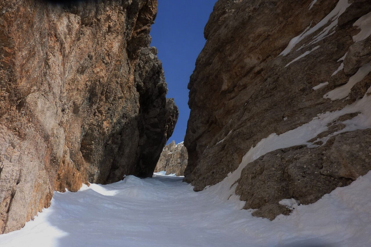 Einfache Orientierung im Anstieg sowie auf der steilen und teils vereisten Abfahrt. Die Abfahrt führt über einen Südhang. Folgende Ausrüstung wird empfohlen: Produkte für alpine Sicherheit im Schnee, Freerideski und Skitourenhelm. Es empfiehlt sich die Einkehr in das Rifugio Maria bei der Bergstation, welches nach Maria Piaz, der Pionierin des Tourismus am Pordoipass, benannt wurde. Beste Jahreszeit: Januar bis April. Uns erwarten kurze Stücke mit bis zu 45° Hangneigung.