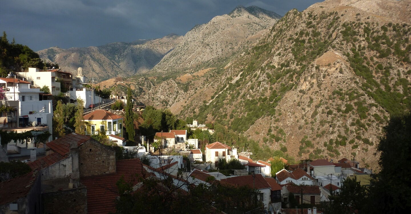 Am Hauptplatz von 01 Argiroupoli (600 m) mit der Kirche und dem Torbogen gehen wir die Asphaltstraße in das Unterdorf hinunter. Wir erreichen nach 120 m einen weiteren Platz, gehen links an dem Haus mit den braunen Fensterläden vorbei und in die Gasse hinunter. Bei der folgenden Weggabelung halten wir uns rechts und nach 60 m abermals rechts. Wir befinden uns nun auf einem steil bergab führenden Pfad zu den Quellen Agia Dynami des Mouselas-Flusses. An der Asphaltstraße angekommen, gehen wir links. Nach 500 m endet diese, wir gehen nun links auf der relativ unbefahrenen Straße durch eine enge Schlucht parallel zu einem Flussbett.