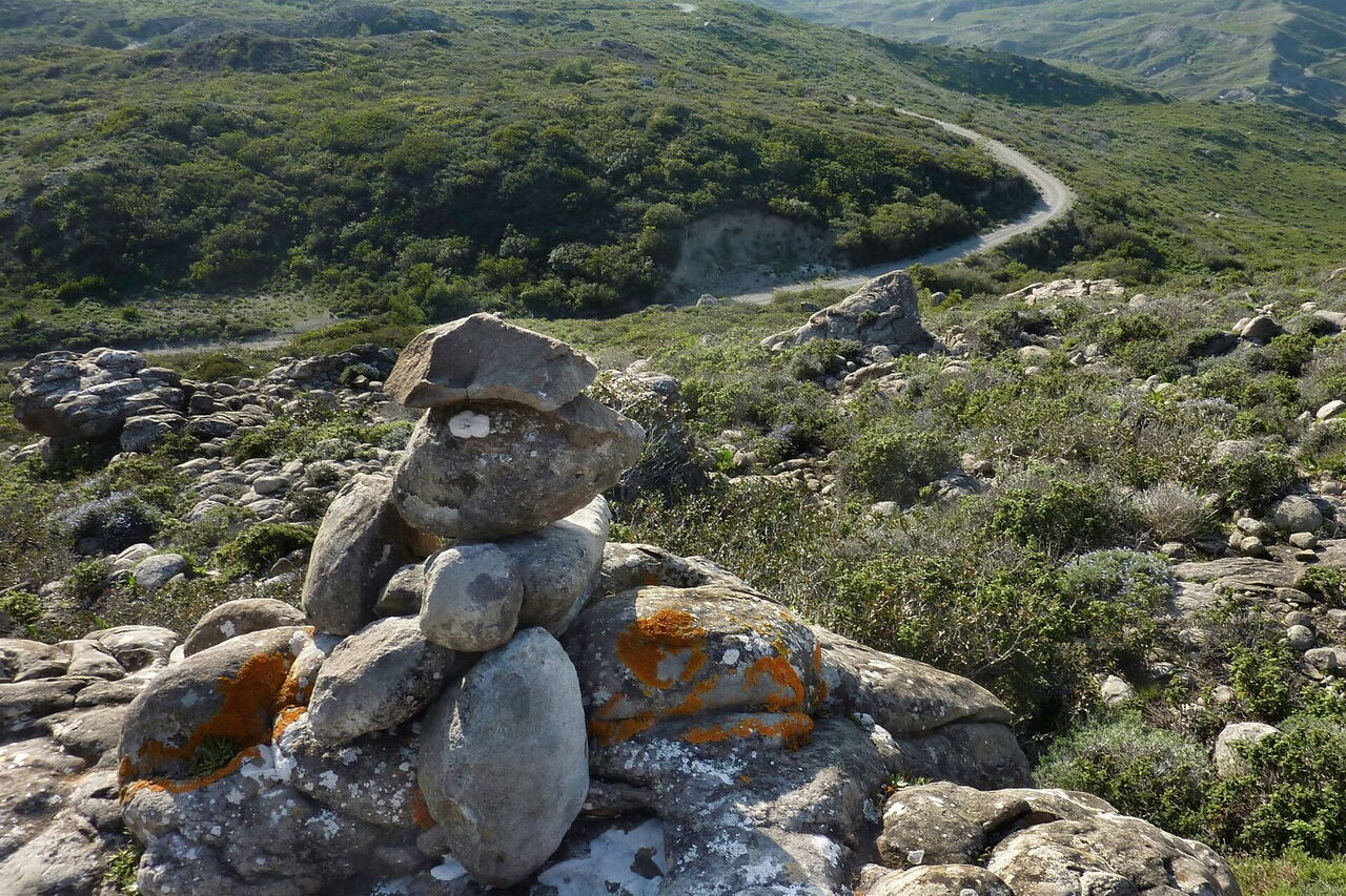 Wir passieren zwei Ziegenzäune und gehen nun in direkter Linie auf den zu besteigenden Berg und die dahinter liegenden Windräder zu. Wir erreichen die (02) Einsattelung (342 m) und können Richtung Westen und Osten das Meer ausmachen. Ein Steinmännchen markiert den Aufstieg auf dem Bergrücken in Richtung der Windräder. Auf einem gut ausgetretenen Ziegenpfad übersteigen wir schnell den ersten und den zweiten Hügel.
