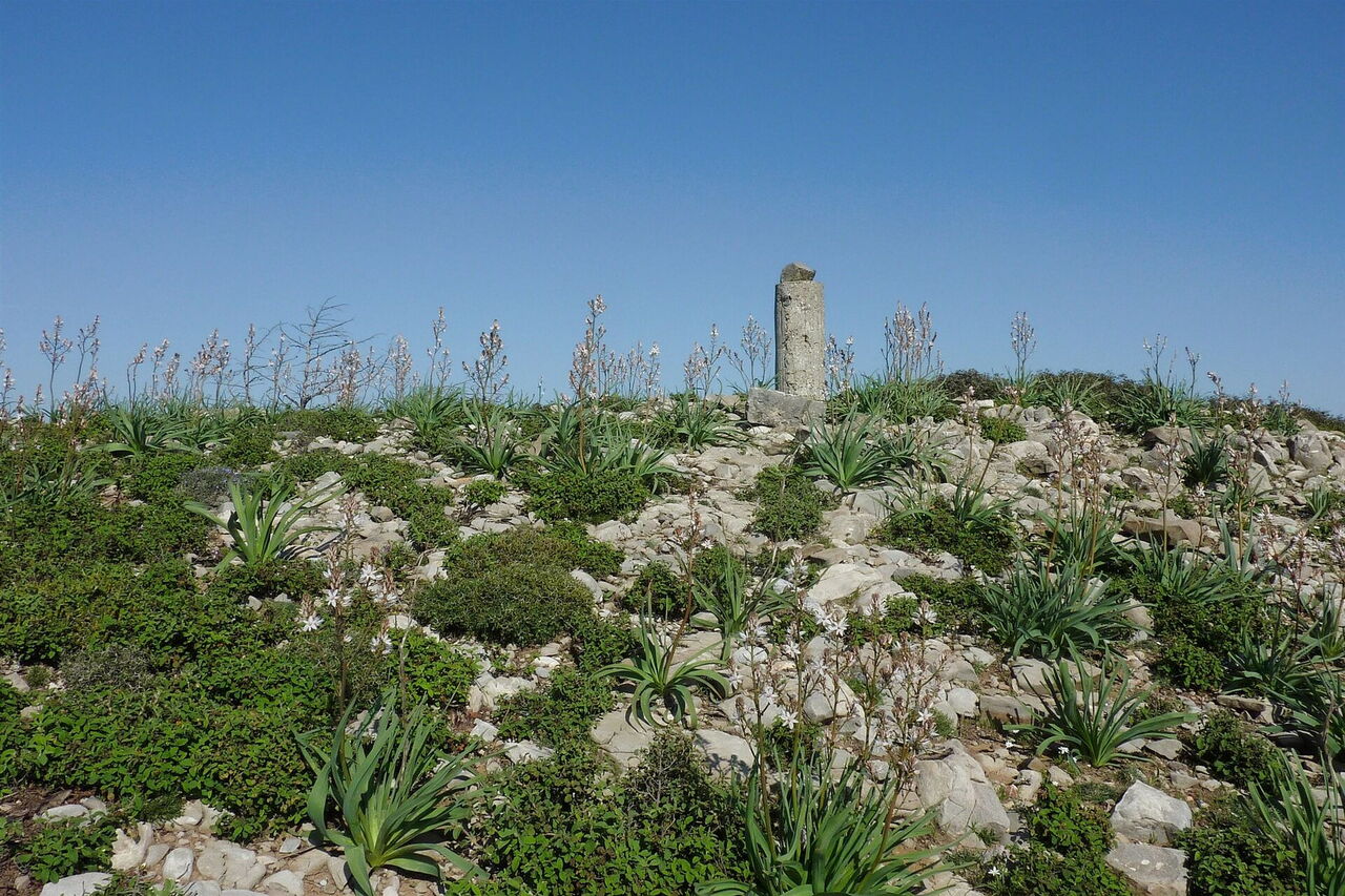 Vom Gipfel gehen wir weiter Richtung Windräder zu einer Einsattelung herunter und im weiteren Verlauf überschreiten wir weitere 3 Hügel. In der dann folgenden Senke befindet sich das erste Steinmännchen. Hier quert halb rechts ein Ziegenpfad den Hang. An dieser Stelle beginnt der (04) Abstieg (447 m). Im weiteren Verlauf treffen wir auf weitere Steinmännchen, bis wir bei einem gut sichtbaren Steinmännchen den Bergrücken überqueren. Unterhalb sehen wir schon die Schotterpiste. Hinter dem Bergrücken gehen wir zunächst links, um nach 20 m rechts zu einem Steinmännchen zu queren und nun durch den steilen, mit Buschwerk durchsetzten Hang bis zur Piste abzusteigen.