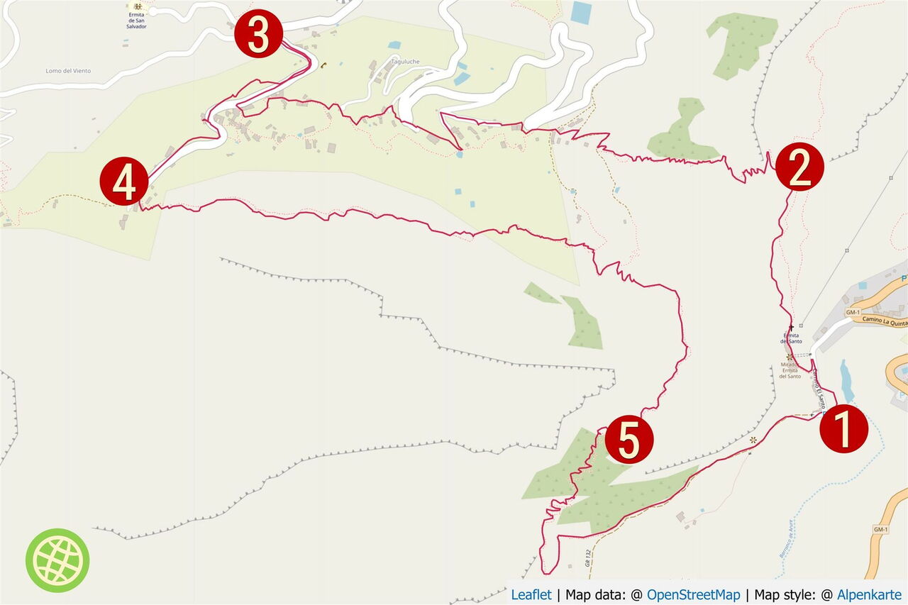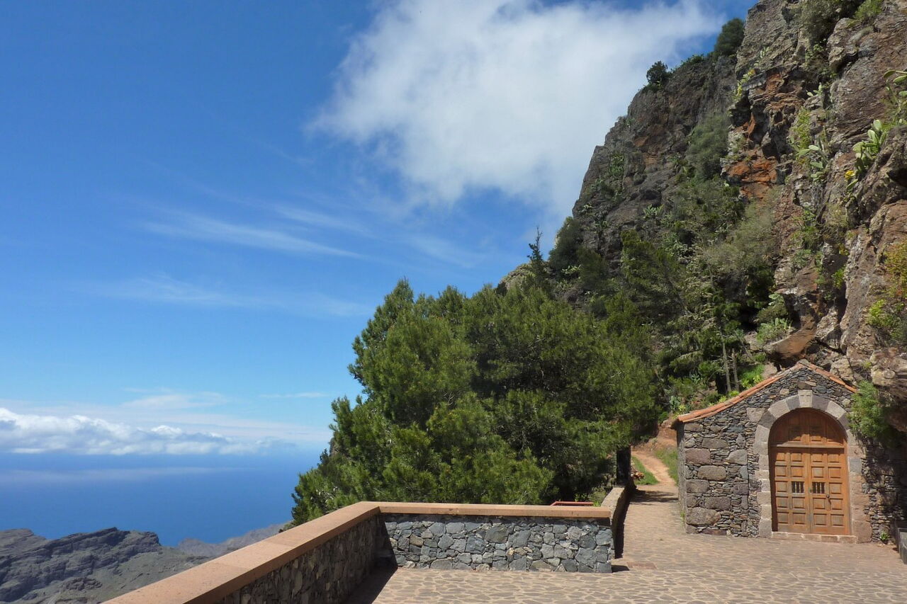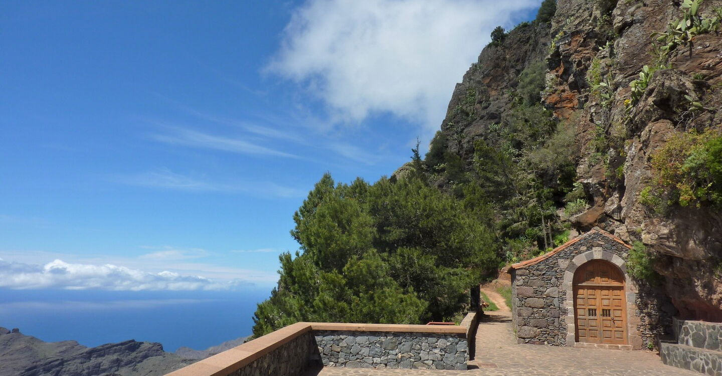 Vom (01) Start und Ziel in Arure (783 m) gehen wir unter dem großen Wasserviadukt hindurch und erreichen den ersten Höhepunkt des Tages, den Mirador del Santo. Er verdankt seinen Namen der nur einige Meter entfernt stehenden Kapelle, der Ermita del Santo. Von der Aussichtsplattform, die sich 800 m über dem Meeresspiegel befindet, genießt man einen überwältigenden Tiefblick in das Tal von Taguluche mit seinem imposanten Schluchtauslauf. Weiter rechts am Mirador befindet sich die Ermita del Santo. Sie liegt geschützt unterhalb einer mächtigen Felswand - dem Naturdenkmal Monumento Natural del Lomo del Carretón.