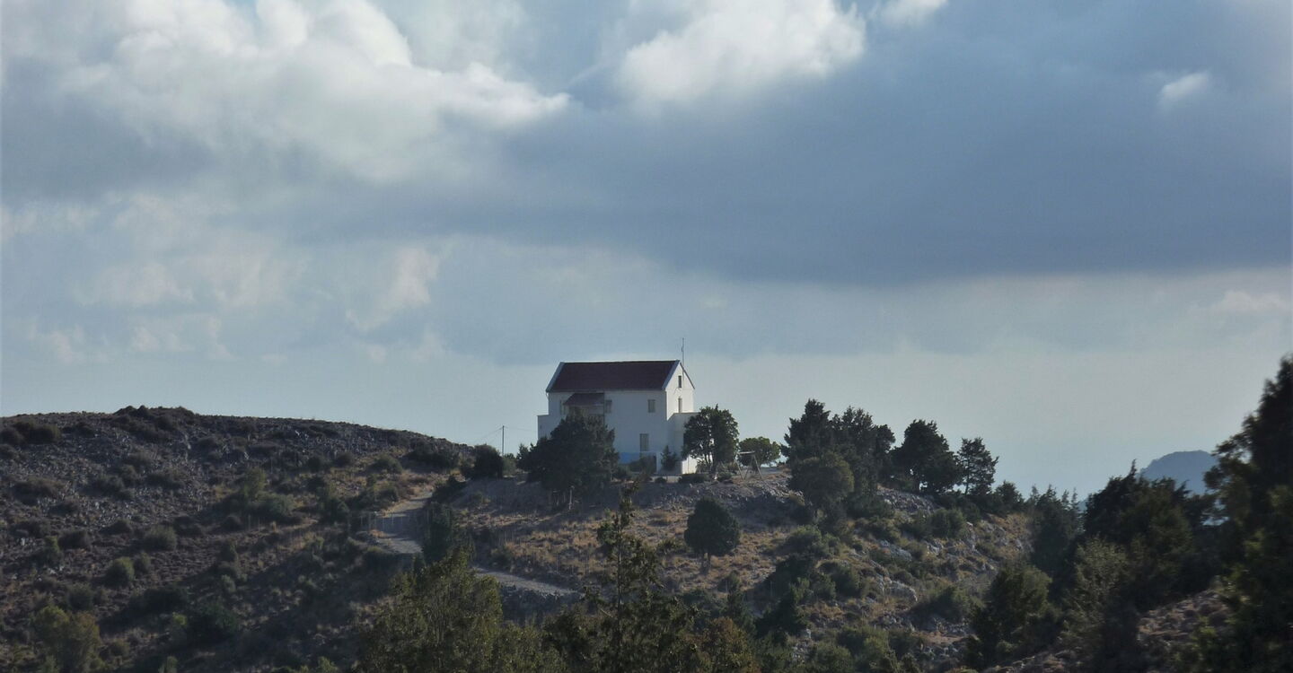 Durch einen lichten Bergwald aus Kiefern und Kermeseichen geht es in engen Kehren bergauf. Hinter einem Ziegengatter erreichen wir eine Hochebene und gehen rechts an dem vor uns liegenden Haus vorbei. Nachdem wir abermals Ziegengatter passiert haben, gehen wir auf der 04 Forststraße (1136 m) links bergauf.