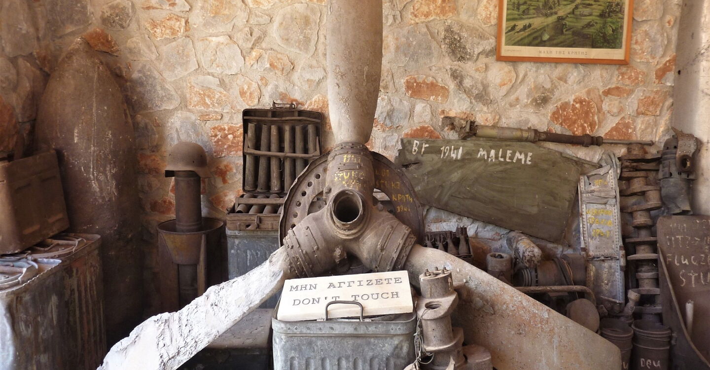 Nach 100 m erreichen wir das rechts oberhalb liegende 02 Kriegsmuseum Askifou (689 m). Ein sehr lohnenswerter Abstecher, denn es werden mehr als 2000 Exponate aus der Zeit zwischen 1940-1944 gezeigt. Andrew G. Hatzidakis, der Sohn eines Kriegsveteranen, hegt und pflegt die Exponate und hält somit die Geschichte am Leben. Wir gehen auf dem eingeschlagenen Weg durch die Rechtskurve und lassen den ersten linken Abzweiger liegen, biegen dann aber bei der folgenden Weggabelung mit der großen Eiche links ab. Bei einer kleinen Kreuzung mit einem Wasserhaus gehen wir rechts und sofort wieder links, um dann nach 150 m rechts leicht bergauf bis zur Hauptstraße vorzugehen.