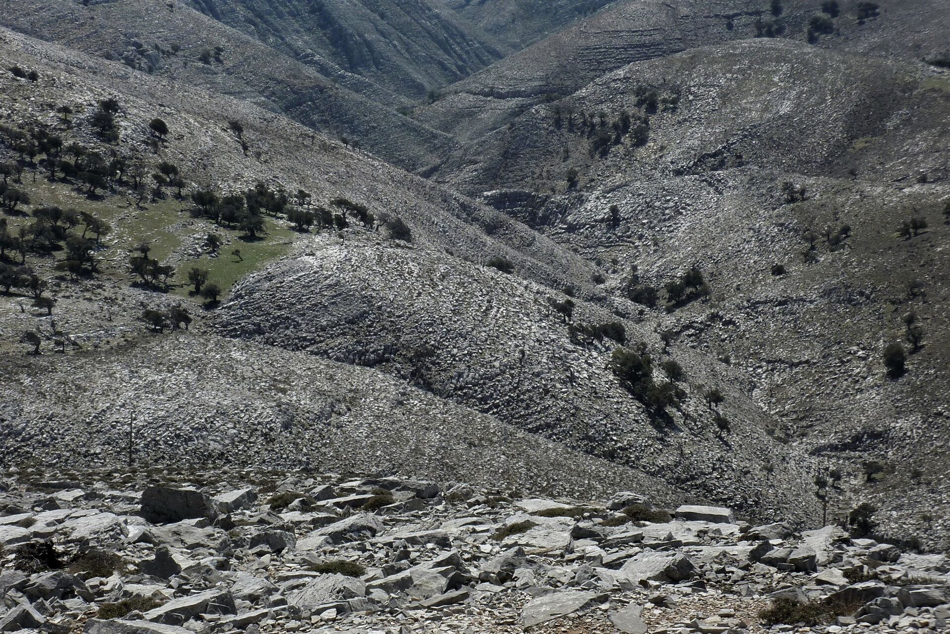 Vom (01) Start und Ziel Agios Isidoros (525 m) gehen wir auf der ortsauswärts führenden Straße Richtung Laerma, bis wir auf eine links bergauf führende Piste treffen, die wir in der ersten Linkskurve nach halb rechts auf einen beginnenden Pfad durch Ziegengatter verlassen. Nach 250 m durch eine Schlucht führt der Weg über einen Bergrücken weiter bergauf.