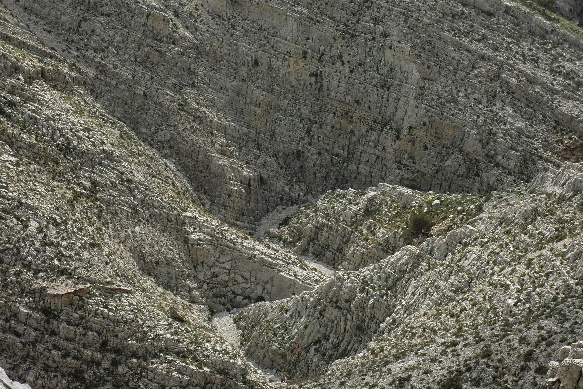 Wir queren zunächst auf einem nahezu ebenen Stück halb rechts den Hang, bis wir dann kontinuierlich an Höhe verlieren. Der Untergrund wird steiniger und wir passieren ein Trockenflussbett. Hier beginnen wir mit unserem direkten Abstieg über (04) Blockgestein (941 m), unter gelegentlicher Zuhilfenahme der Hände. Im Canyon angekommen, liegen 3,8 km Erlebnis vor uns.