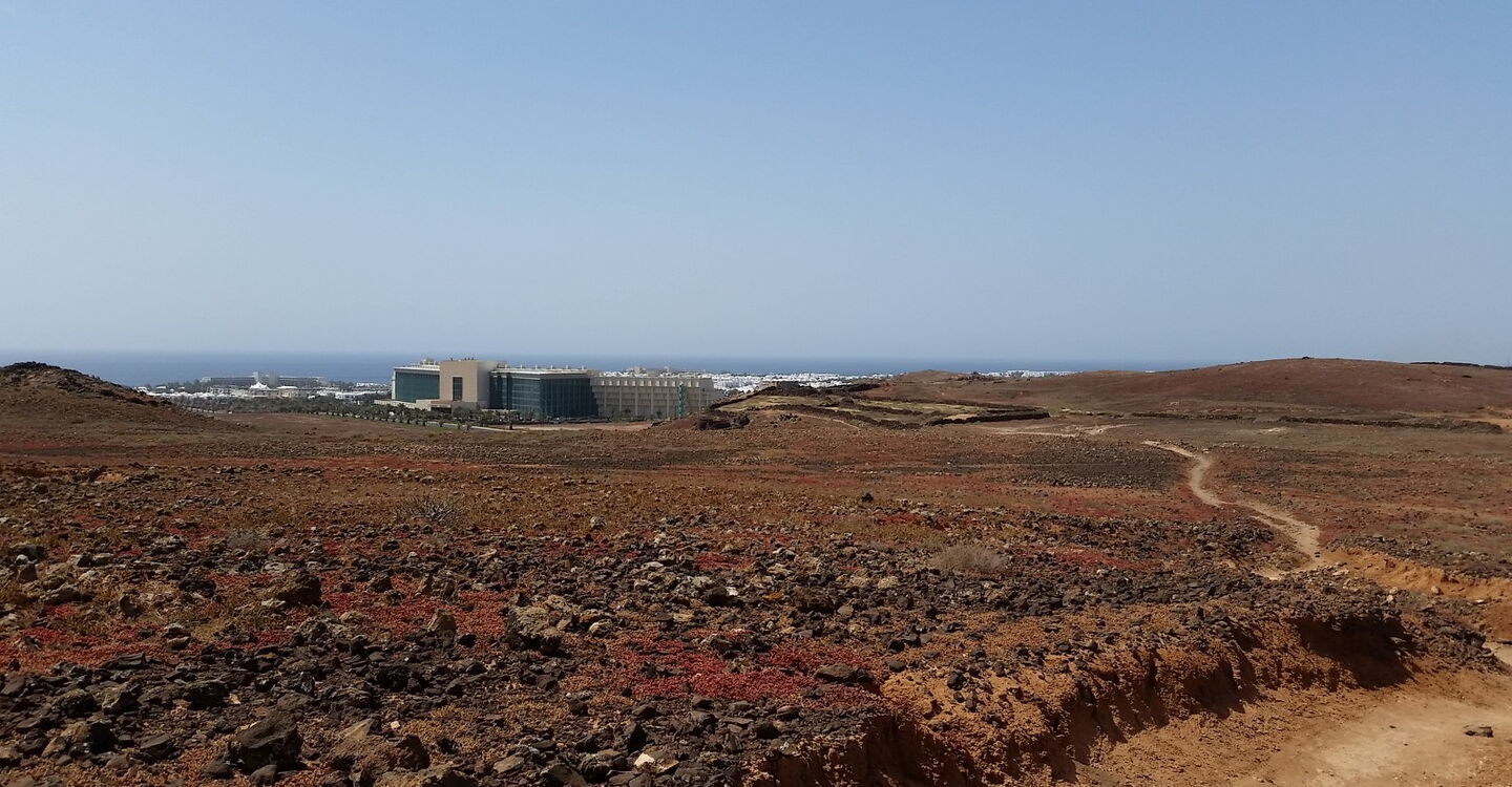 Nach 200 m, bei dem Abzweiger von der Hauptstraße nach rechts, überqueren wir die Straße nach links, passieren die hohe Mauer bei einem Durchlass und beginnen mit dem Aufstieg zum Gipfel der (03) Montaña Corona (225 m). Bei guter Sicht ergeben sich trotz der vergleichsweise geringen Höhe überraschende Fernblicke: So kann man entlang der Ostküste bis nach Arrecife blicken - gut zu erkennen am einzigen Hochhaus der Insel - und bei sehr guter Fernsicht kann man sogar die hell leuchtenden Dünen von Fuerteventura ausmachen. Richtung Norden erstreckt sich das Risco-de-Famara-Gebirgsmassiv (halb rechts), wir sehen die Burganlage von Santa Barbara oberhalb von TEGUISE und weiter links (Richtung Westen) lassen sich die Vulkane Montaña Tamia (550 m) und die Montaña Blanca (595 m) gut ausmachen.