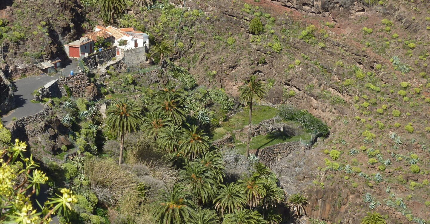 Am (01) Start und Ziel (612 m) übersteigen wir die Metallkette und gehen bergab - vorbei an einigen Häusern -, bis wir nach einer langen Kehre das letzte Haus vor dem Barranco erreichen. Noch vor dem Haus (etwa 20 m) führt rechts ein Pfad auf die Terrassenfelder am Barranco herunter. Wir gehen an dem rechts von uns liegenden Zaun entlang, bis wir in das Barranco einsteigen. Durch dieses gehen wir rechts weiter, bis der Zaun endet und wir oberhalb eines Wasserfalls stehen. Hier beginnt links bergauf ein selten begangener Pfad. Im weiteren Verlauf passieren wir eine rechts von uns stehende Palme und sehen eine Ruine, die sich 60 m oberhalb des Weges befindet. Kurzfristig ist der Pfad schwer auszumachen, bis wir auf einen gut zu erkennenden Pfad stoßen, welcher nun halb links - in östliche Richtung - bergab führt.