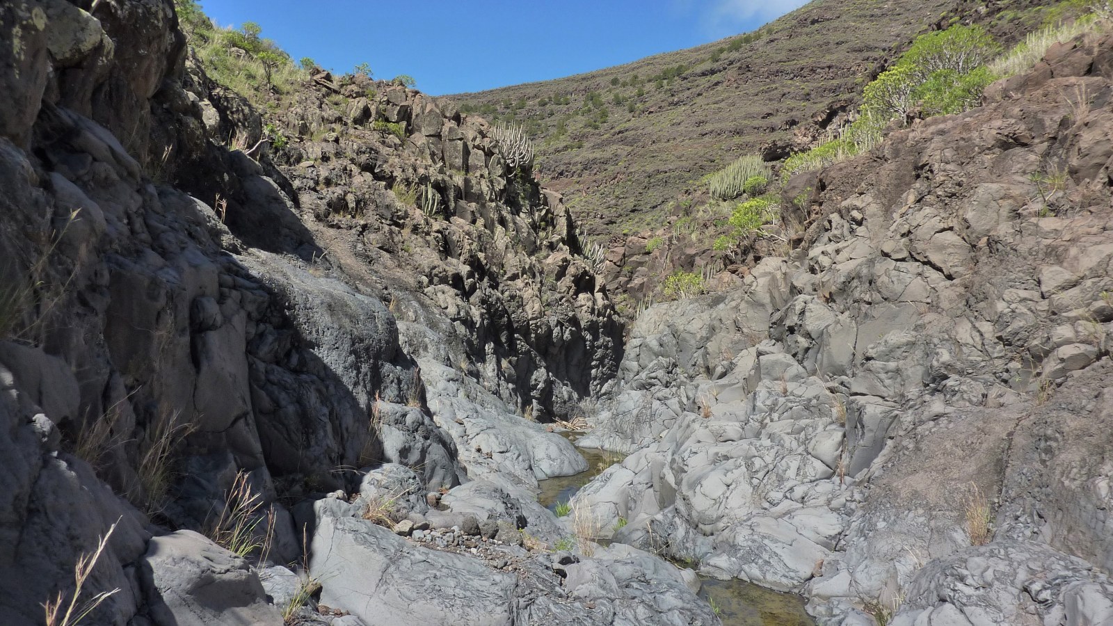 In diesem unwegsamen, weglosen und steilen Gelände steigen wir nun zur (03) Schlüsselstelle bei den Palmen (362 m) ab. Auch an dieser Stelle müssen wir einen unüberwindbaren Wasserfall umgehen. Dazu queren wir das Barranco und gehen - ohne dabei an Höhe zu verlieren - auf der rechten Flussseite talauswärts, bis der Weg eine 90°-Wendung nach rechts macht. An dieser Stelle können wir uns einen Abstiegsweg direkt in das Barranco bahnen. Aber auch nach diesem Abstieg wird uns keine Atempause gegönnt, denn nur einige Meter weiter mündet das Barranco in eine tiefer liegende Gumpe. Bei wenig Wasserstand kann man in diesem trockenen Flussbett einige Meter absteigen, um dann links über rotes Gestein die Gumpe zu umgehen.