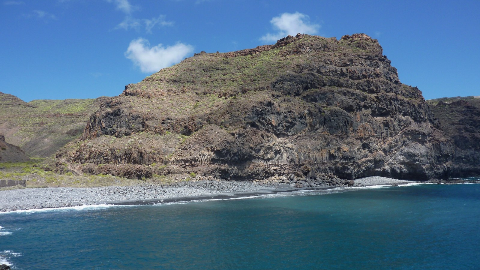 So weit wie möglich rechts im Trockenflussbett laufend, erreichen wir den (05) Playa de Iguala (5 m). In Kehren, die auf den westlich vom Barranco liegenden Höhenzug führen, steigen wir auf und folgen im weiteren Verlauf dem Fernwanderweg GR 131 und der Ausschilderung zum Valle Gran Ray. Nach 620 Höhenmetern haben wir den Parkplatz erreicht.