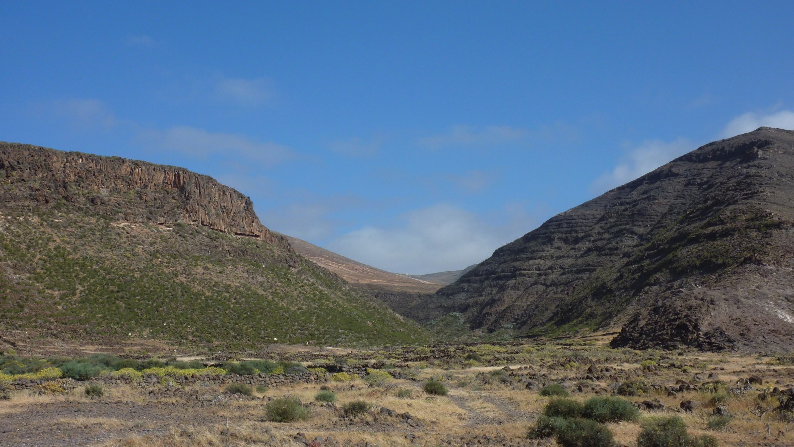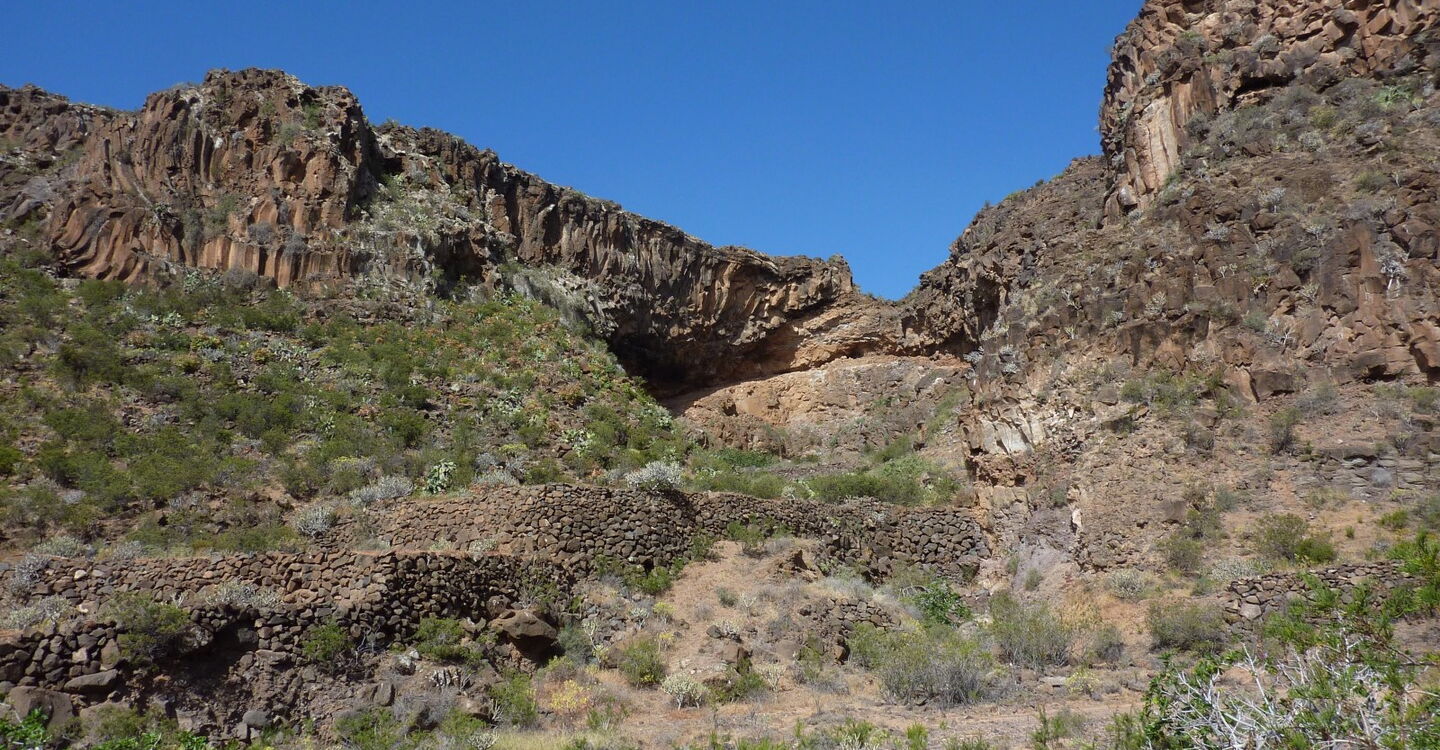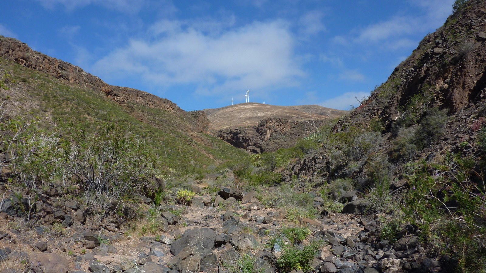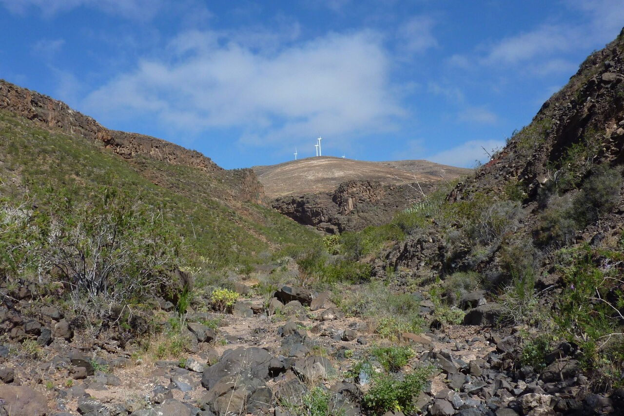 Nach 400 m, eine Leitplanke beginnt an dieser Stelle, biegt links der (02) Weg zum Barranco (104 m) ab. Wir wandern durch intensiv landwirtschaftlich genutzte Flächen. Doch sehr schnell wird die Nutzung extensiv. Links erhöht sehen wir einen Windpark. Nachdem wir an zwei Wohnwagen vorbeigekommen sind, ist kaum noch ein Pfad zu erkennen. Bei einem Steinmännchen und einer Steinmauer steigen wir in das trockene Flussbett hinab und wandern in ihm weiter. Wir passieren terrassenförmig angelegte Felder sowie vereinzelt stehende Feigenbäume und treffen auf eine 2 m hohe Staumauer, die wir umgehen. Inzwischen ist das Trockenflussbett nur noch 5 m breit. Das Barranco hat sich an dieser Stelle tief in die Landschaft gebohrt und die herabrauschenden Wassermengen haben die Vegetation bis auf den blanken Fels weggerissen.