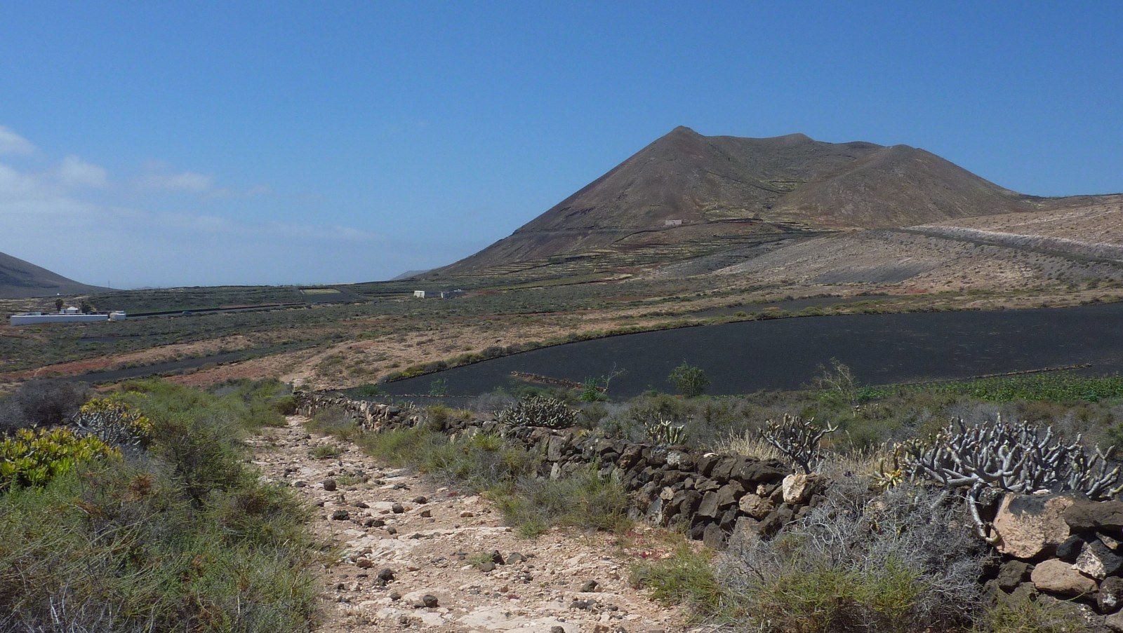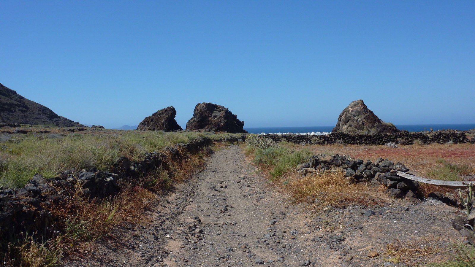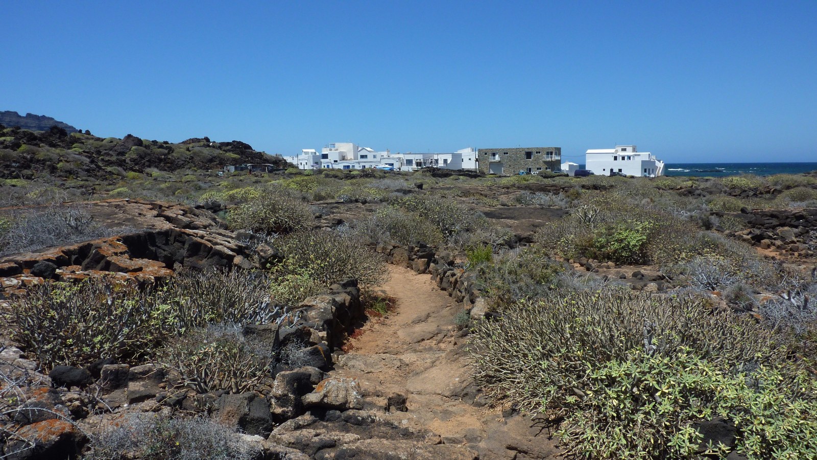 Wir haben nun einen Abschnitt mit weißem Sand erreicht. Von hier aus gehen wir auf einem rechts von uns beginnenden Pfad landeinwärts. Schon nach einigen Metern befinden wir uns auf einer Fahrspur, die bis zur LZ-1 führt. An dieser (03) Schlüsselstelle (19 m) gehen wir 70 m rechts entlang der Hauptstraße, um dann links auf den kleinen Parkplatz mit einem Lavastein in der Mitte abzubiegen. Ziemlich genau im rechten Winkel zur Hauptstraße, in südwestlicher Richtung, beginnt nun ein Pfad quer durch die Malpais de la Corona. Außer den platt getretenen Lavasteinen, die aber immer gut auszumachen sind, gibt es hier keine weiteren Orientierungshilfen. Sollte man trotzdem das Gefühl haben, vom Weg abgekommen zu sein, so wäre in diesem Falle die Zuhilfenahme des GPS-Tracks hilfreich. Wir erreichen eine kleine Anhöhe und sehen rechts von uns ein Kraterloch mit groß gewachsenen Wolfsmilchgewächsen sowie die ersten Häuser von Orzola.