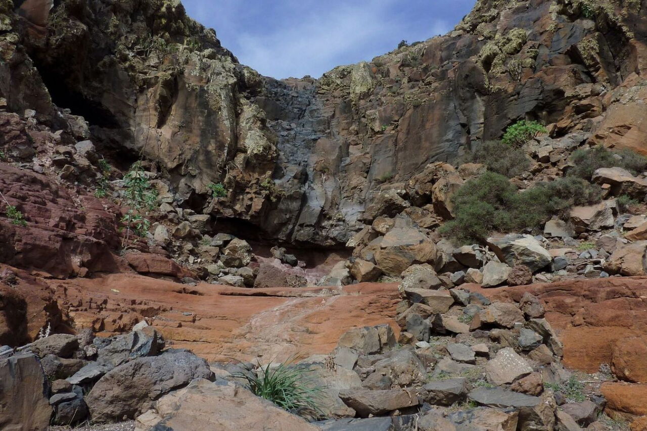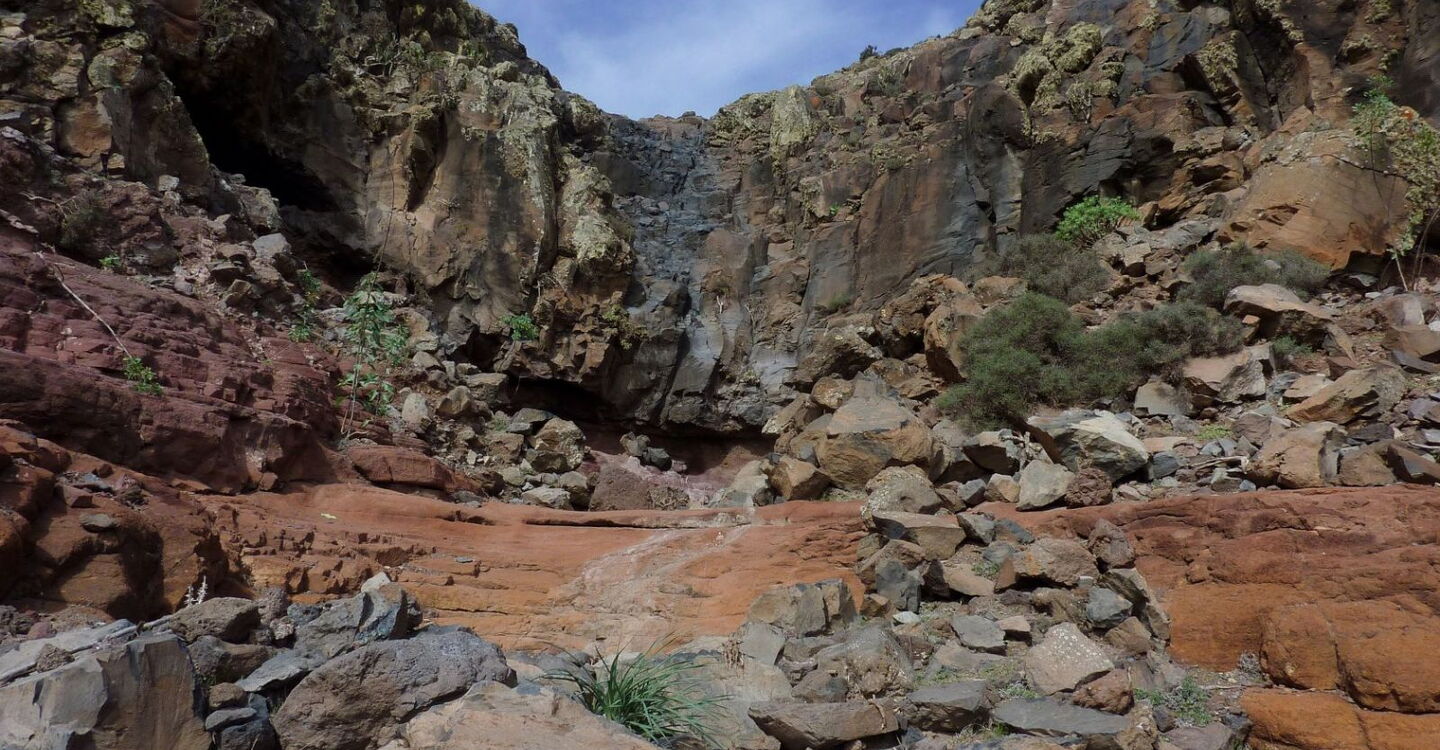 Vom (01) Start und Ziel (53 m) laufen wir auf der Schotterpiste taleinwärts, parallel zum Barranco Esquinzo. Nach 450 m passieren wir einen Einsiedlerhof mit Ziegenhaltung. Nach 750 m führt die Schotterpiste halb rechts bergauf zu einem Gambuesa. An dieser Stelle gehen wir direkt in das Barranco herein – unser Wanderweg für die nachfolgenden 1,3 km. Können wir anfangs noch bequem im Barranco gehen, so wird es bald zunehmend gerölliger. Im weiteren Verlauf wandern wir über ausgewaschene Felsen und erreichen einen ersten kleinen Wasserfall, den wir auf seiner rechten Seite umlaufen.