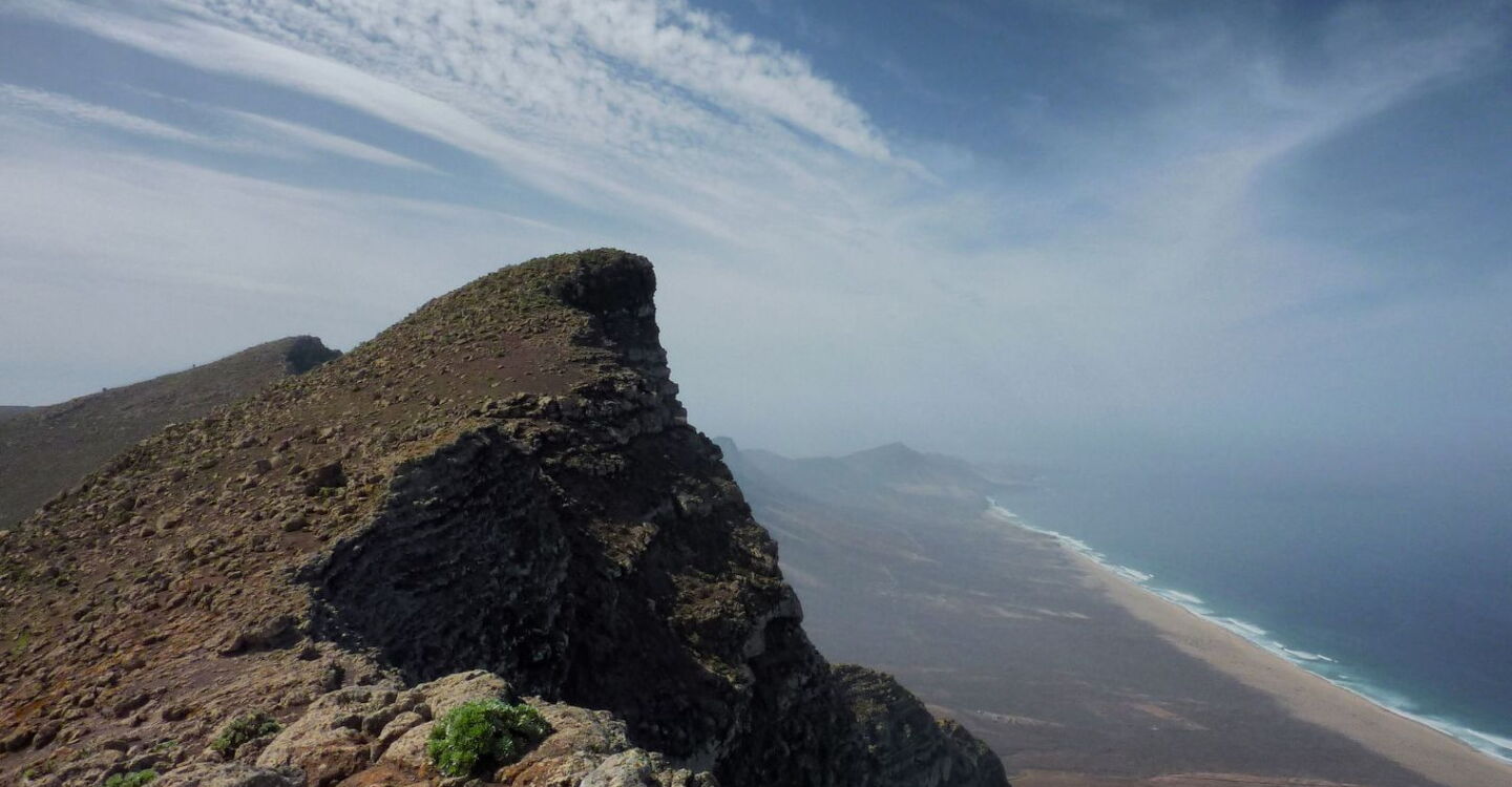 Die Besteigung des zweithöchsten Berges der Insel kommt einer Hochgebirgstour in den Alpen schon sehr nahe. Mit 755 Höhenmetern und knapp 14 km Länge ist sie auch sehr sportlich. Unsere Wanderung beginnt auf einfachen Wegen in einem mächtigen Schluchtauslauf, dem Barranco Esquinzo im Jandia-Bergmassiv im Süden von Fuerteventura. Zunehmend verschlechtert sich der Weg, bis wir die schwierigste Stelle erreichen, einen 7 m hohen Wasserfall – ein sehr beeindruckendes Potpourri aus verschiedenen Gesteinsfarben. Der 360°-Rundblick vom Gipfel lässt jeden innehalten. Über sanfte Hügelketten geht es zurück zum Ausgangspunkt.