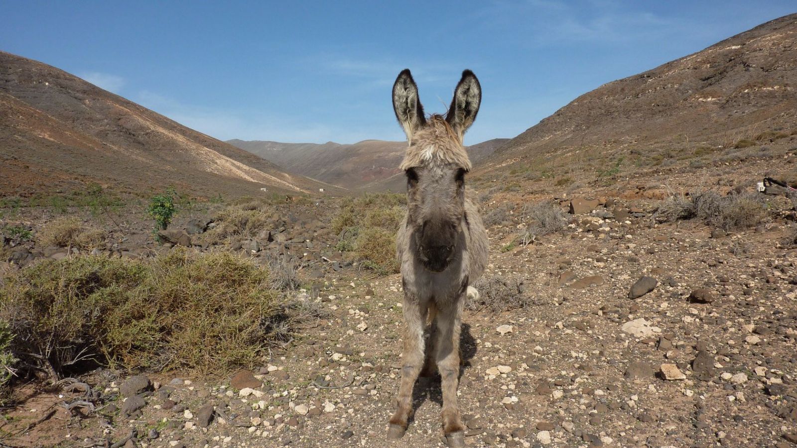 Anschließend gehen wir rechts auf dem Bergrücken bis zu einer Steinruine vor und orientieren uns beim weiteren Aufstieg an der Grundstücksbegrenzungsmauer, bis wir den Grat erreicht haben, der bis zum Gipfel reicht. Auf diesem gehen wir halb links bis zum Gipfel des (03) Pico de Mocan (792 m) vor. Der 360°-Rundblick lässt uns innehalten. Während die Hänge des Jandia-Bergmassivs nach Nordwesten – Richtung Playa Cofete und Playa Barlovento – extrem steil abfallen, neigen sie sich gemächlich Richtung Südosten.
