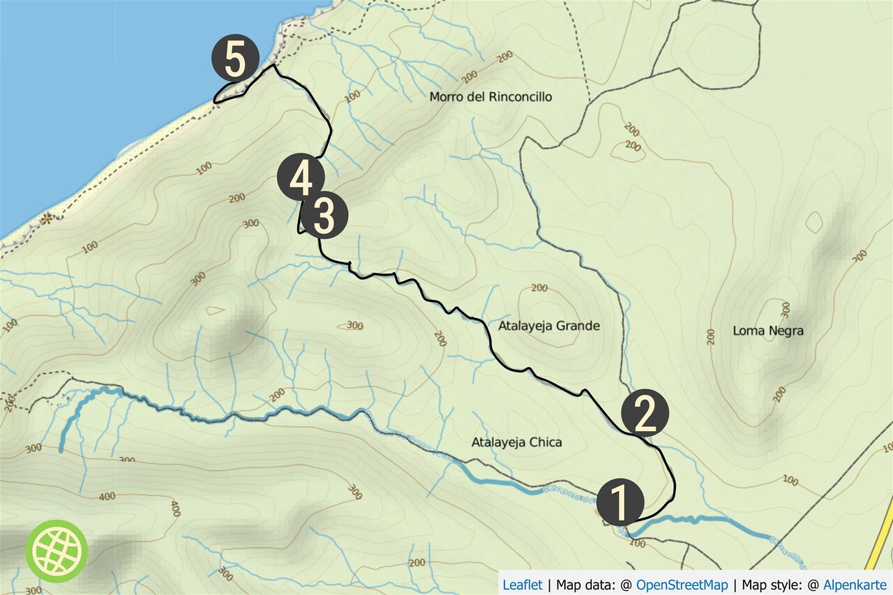 Nach nur 100 m Aufstieg auf einem schmalen Pfad gehen wir rechts auf dem vor uns liegenden (04) Bergrücken (190 m) mittig bergab. Nach weiteren 300 m steigen wir an einer günstigen Stelle in das Barranco hinab und folgen der Falllinie. Am Ende des Barrancos treffen wir auf einen Küstenpfad, dem wir links 400 m folgen.