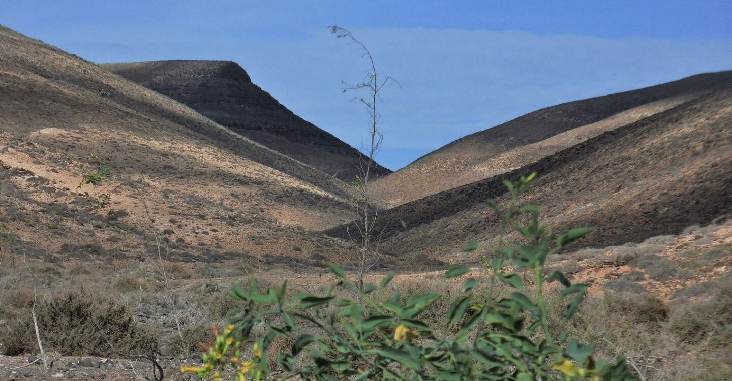 Busanbindung: keine. Mit dem Pkw fährt man 9 km von der Costa Calma auf der FV-2. Genau 1 km nach der Abzweigung links Richtung Risco del Paso – wir haben das breite Barranco Pecenescal gequert – biegen wir rechts ab und anschließend sofort wieder rechts auf die beginnende Schotterstraße. Dieser folgen wir nun 1,5 km, bis wir auf der linken Seite eine Ziegenhaltung sehen. Der Weg gabelt sich nun in drei Richtungen. Man kann hier auf der linken Seite im Gelände das Auto gut parken. Geokoordinaten Parkplatz: 28.126355 -14.286512.