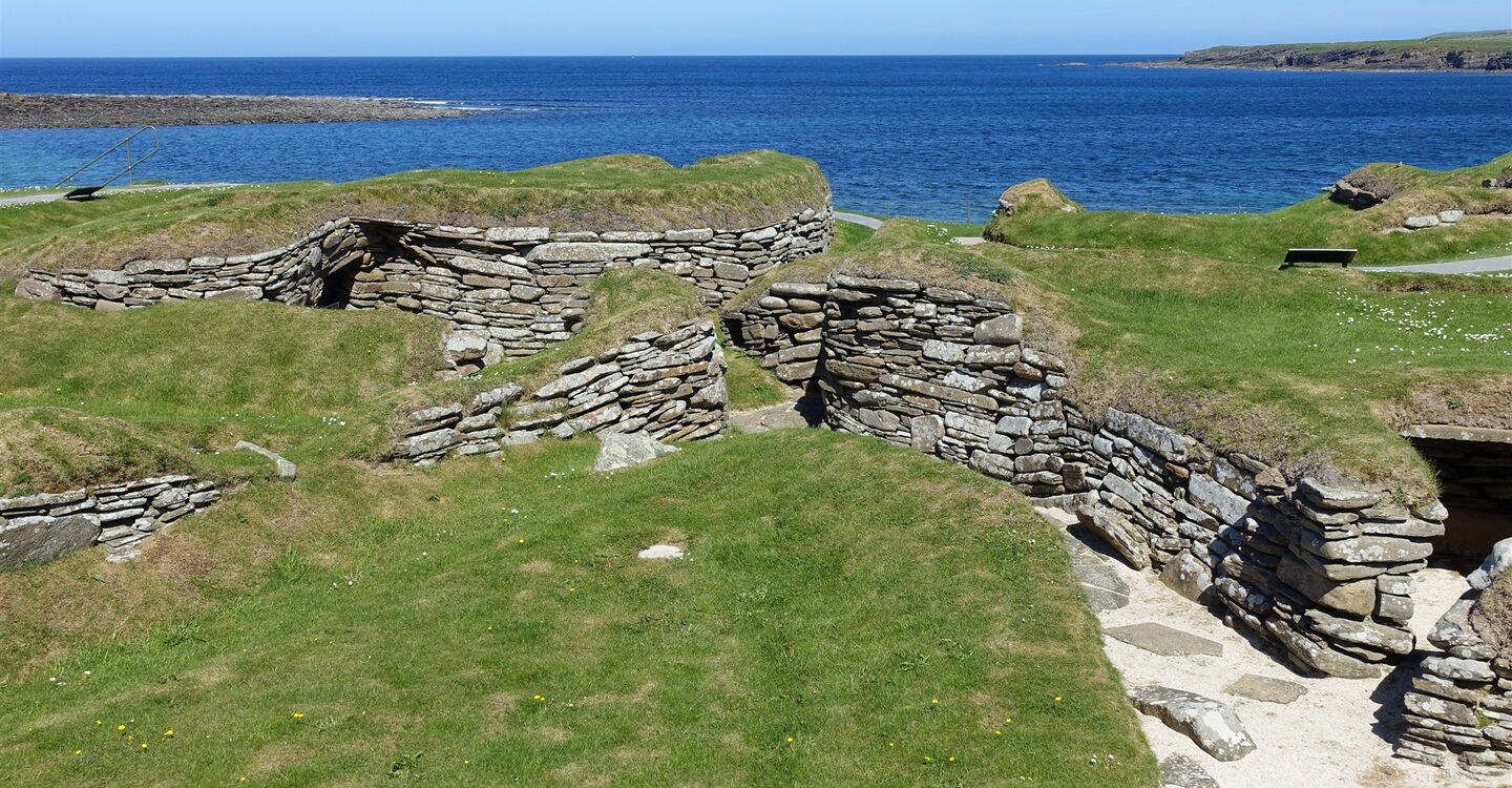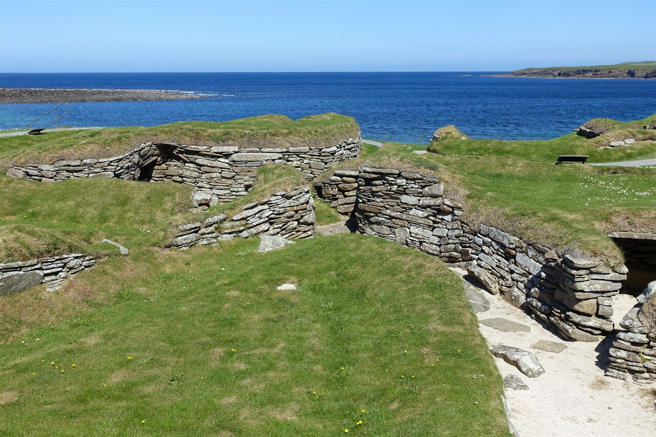 Nachdem wir mit dem Bus von Stromness nach 01 Skara Brae (17 m) gefahren sind, gibt es die Möglichkeit, die jungsteinzeitliche Siedlung Skara Brae aus der Zeit zwischen 3100 und 2500 v. Chr. zu besuchen. Öffnungszeiten: 1. April bis 30. September 9:30–17:30 und 1. Oktober bis 31. März 10:00–16:00. Nur 200 m von den Ausgrabungen entfernt befindet sich das schönste Herrenhaus auf den Orkney-Inseln. 1620 ließ Bischof George Graham das Skaill House bauen; in seiner 400-jährigen Geschichte wurde es kontinuierlich erweitert. Das Haus war auch die Heimat von William Graham Watt, 7. Laird of Breckness, der 1850 das weltberühmte neolithische Dorf Skara Brae ausgegraben hat. Den Besucher erwartet ein Familienhaus aus den 1950er-Jahren mit Exponaten, die die Familie seit dem 17. Jahrhundert gesammelt hat.