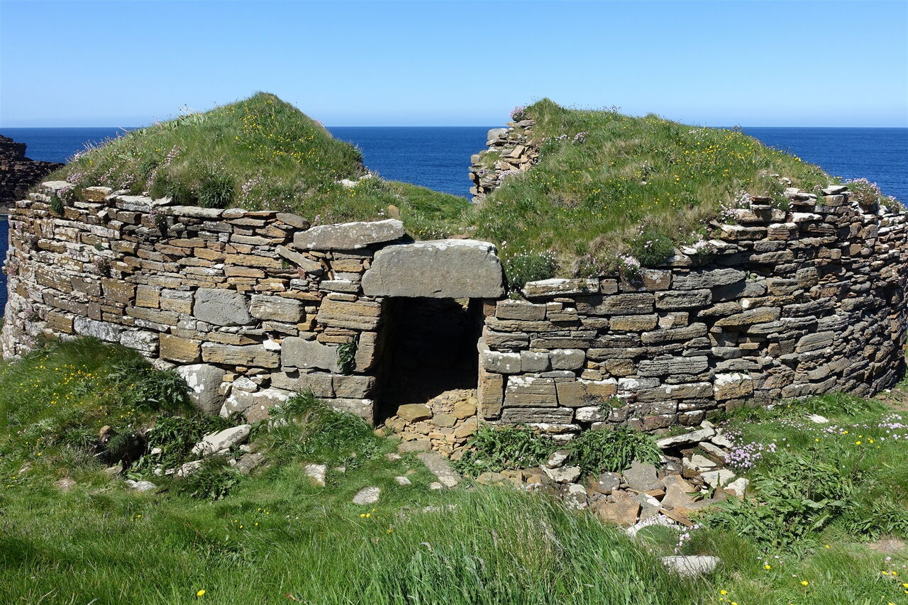 Direkt hinter dem Steinhaus bei den Ausgrabungen gehen wir durch die Pforte und anschließend durch die Dünen auf dem Pfad parallel zum Meer. Nach einem kurzen weglosen Abschnitt erreichen wir einen Steinhaufen und können von dort den weiteren Verlauf der Strecke sehen. Bei besonders guter Sicht kann man die Nachbarinsel Hoy sehen, rechts davon ragt der Old Man of Hoy aus dem Wasser. Nach ungefähr 1,4 km erreichen wir die längste Geo auf den Orkney-Inseln, die 300 m lange und 50 m über dem Meeresspiegel liegende Ramna Geo. Und schon folgt hinter einer Holzbrücke die nächste Sehenswürdigkeit, der 02 Broch of Borwick (18 m). Brochs sind Trockensteinkonstruktionen aus exakt aufeinandergeschichteten Steinen, ohne die Verwendung von Mörtel. Er wurde ca. 1000 Jahre bewohnt, bis er dann aufgegeben wurde, vielleicht als die Reiche der Pikten und der keltischen Skoten 843 n. Chr. unter Kenneth MacAlpin vereinigt wurden.