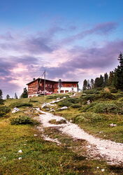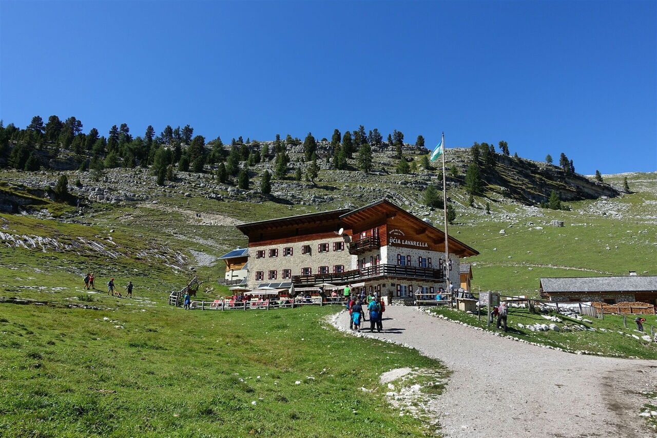 Wir gehen halb rechts, kommen an einem kleinen, dunkelgrünen See vorbei – oft weiden Kühe an seinen Ufern – und erreichen das heutige Etappenziel, die 05 Lavarella-Berghütte (2.050 m).