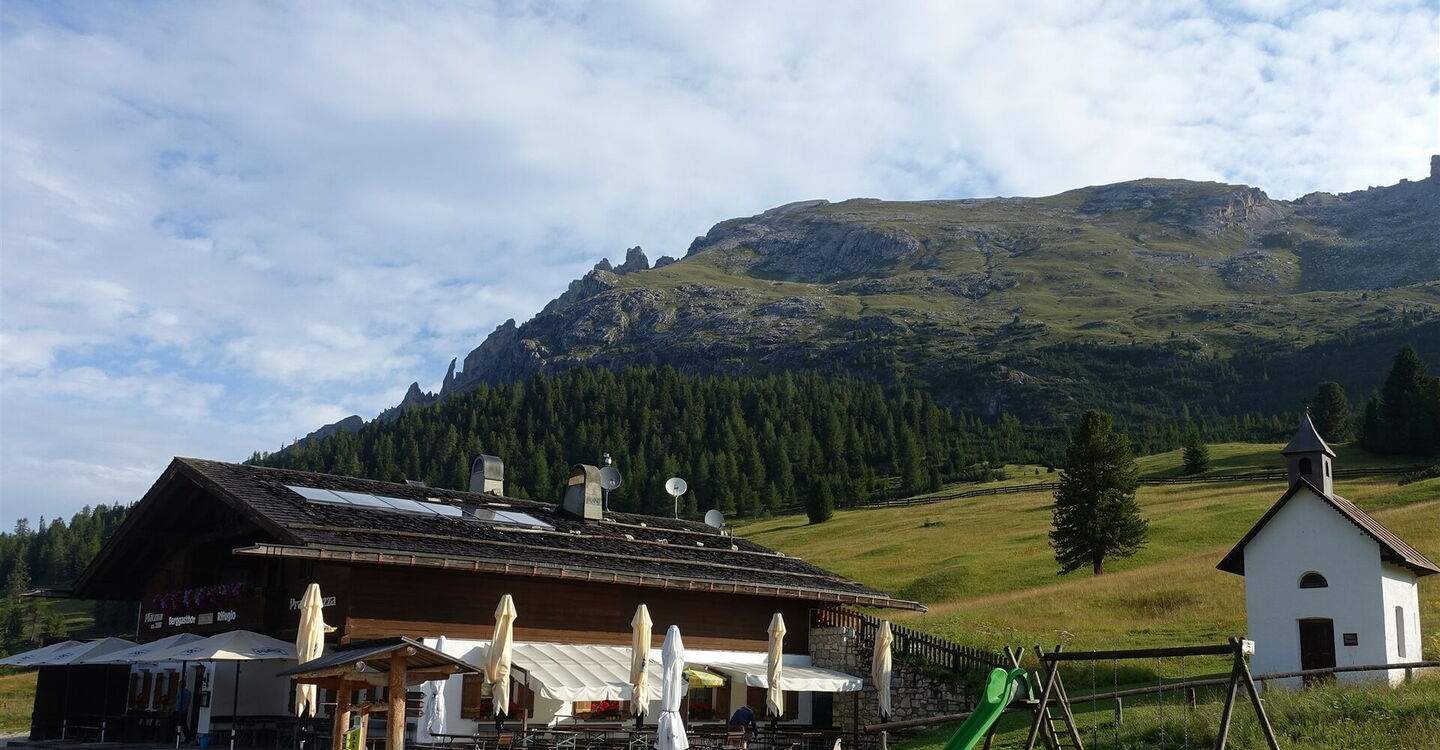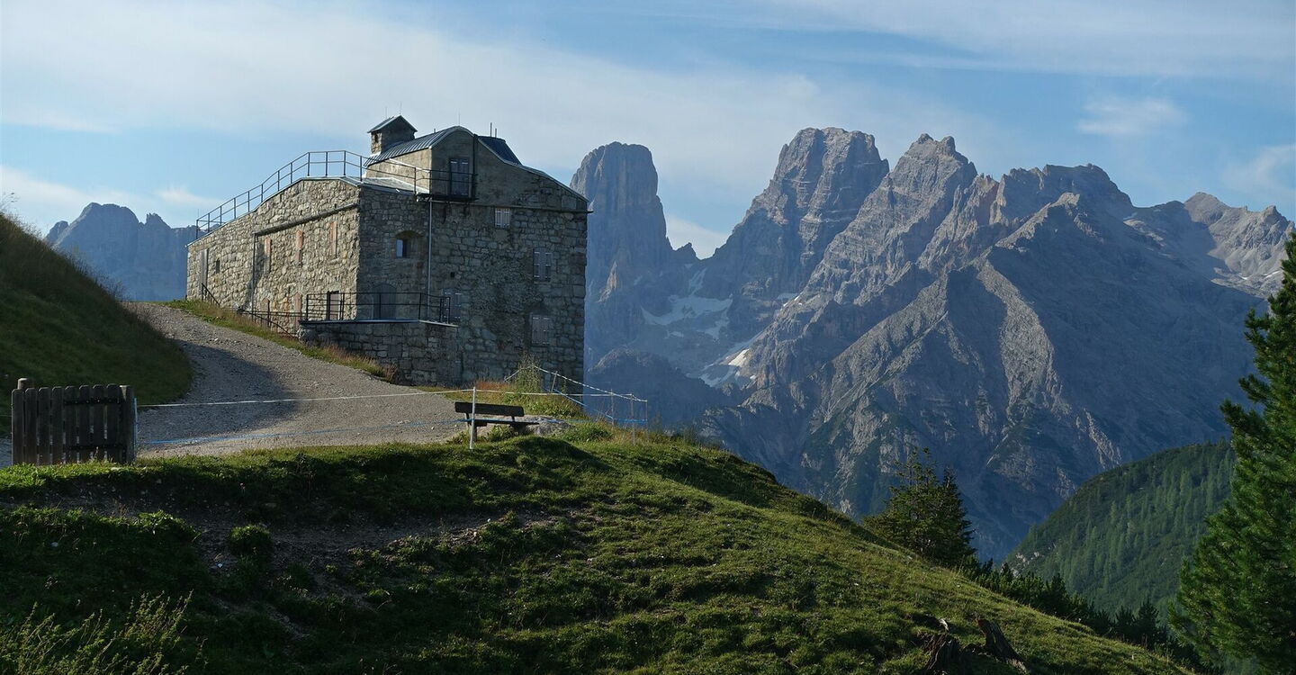 Auf dem Wanderweg 37 gehen wir vom 01 Berggasthof Plätzwiese (2.000 m) in südöstlicher Richtung am Berghotel Hohe Gaisl vorbei. Den linken bergauf führenden Abzweiger zur Almhütte Plätzwiese – hier gibt es keine Übernachtungsmöglichkeiten – lassen wir aus. Hinter einer Brücke gehen wir an der Weggabelung halb links bergauf. Vor uns liegt das 1888–1895 gebaute Fort Prato Piazza (Sperrwerk Plätzwiese), es gehörte zu den österreichischen Befestigungsanlagen an der italienischen Grenze.